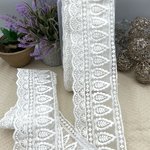 Ce galon dentelle brodé blanc à motifs feuilles est un modèle raffiné et lumineux, parfait pour sublimer vos créations couture et décoratives.