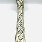 Apportez une note bohème et contemporaine à vos créations avec ce galon tissé vert sauge à motifs géométriques blancs.