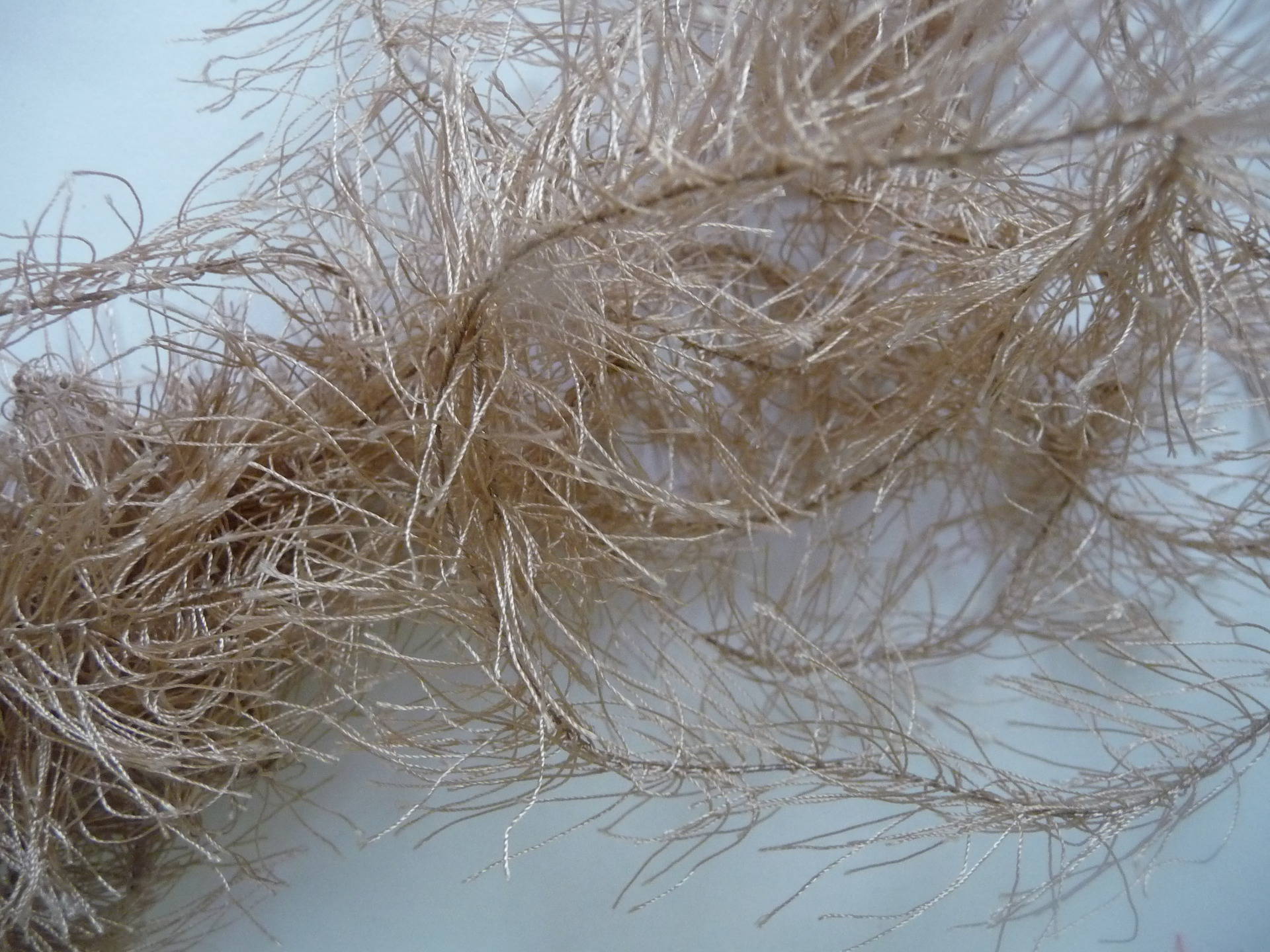 Je vous propose ce joli galon à franges avec structure fil métal, couleur marron clair/beige.