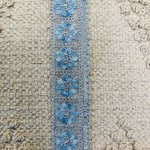 Galon argenté Marguerite bicolore bleu au tissage raffiné, orné de fleurs lumineuses. Idéal pour vos créations couture, customisations et décorations textiles. Découvrez d’autres galons floraux et brillants dans la boutique.