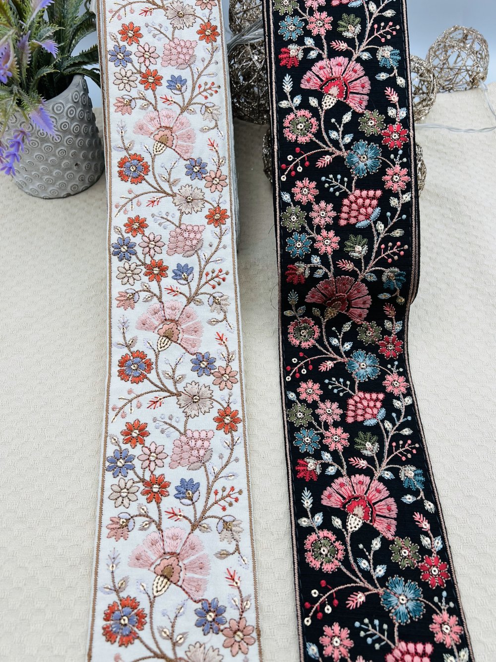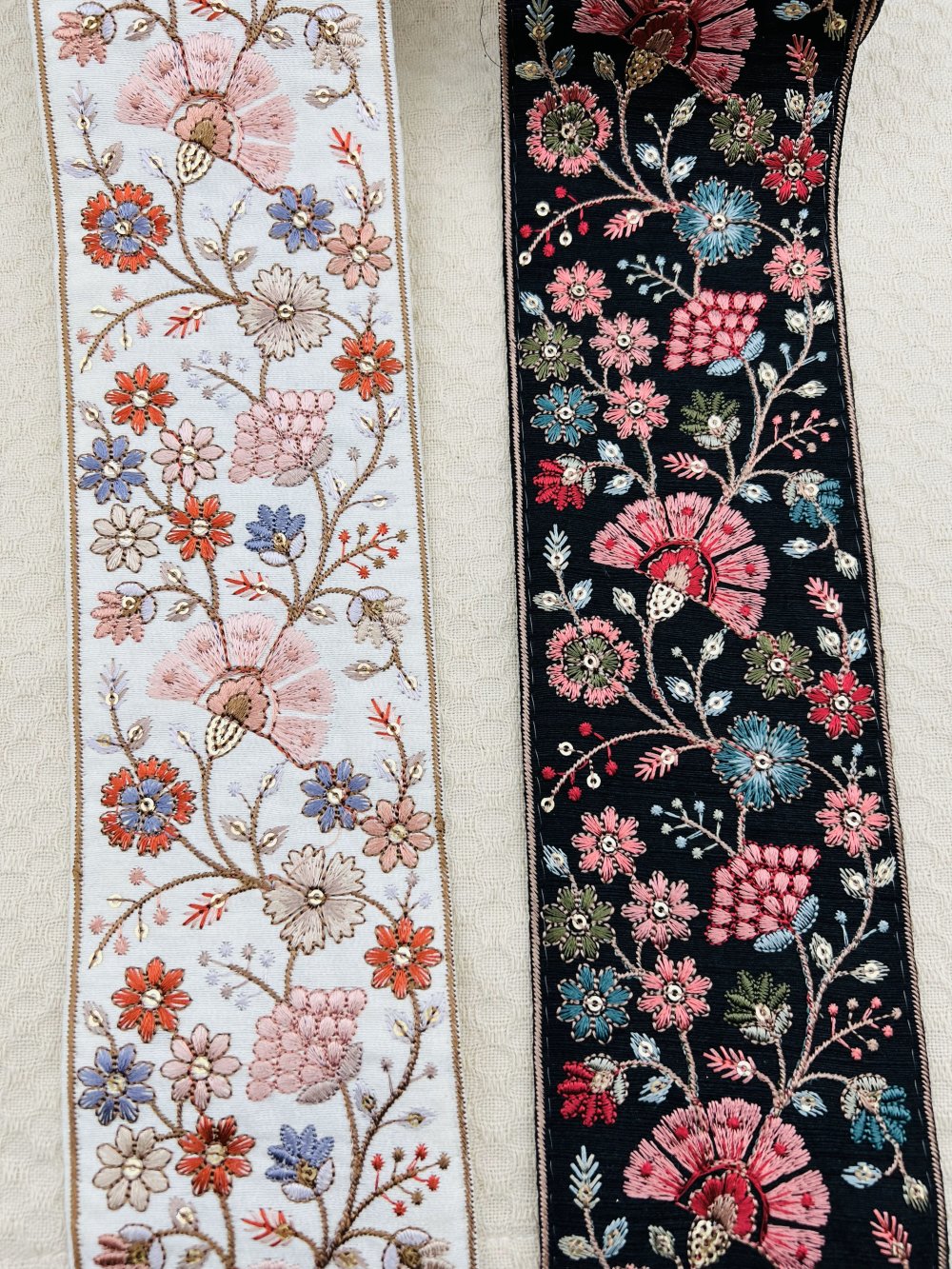 Galon brodé fond blanc ivoire à fleurs pastel, doux et raffiné pour vos créations couture ou déco. Également disponible en fond noir intense.