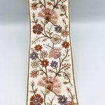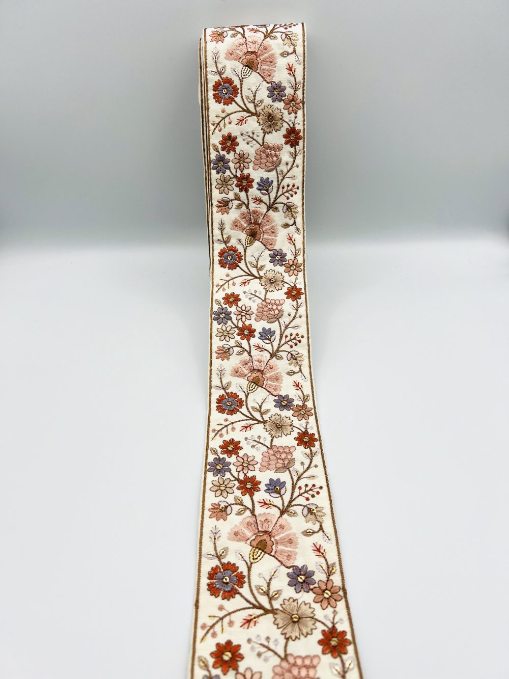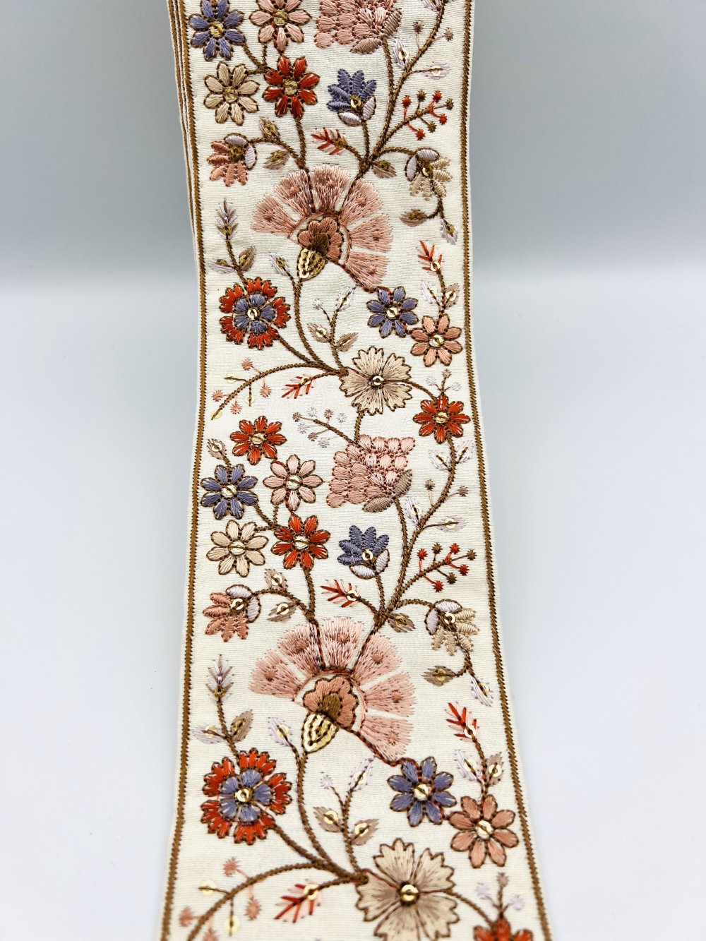 Ce galon brodé à fleurs fond blanc ivoire séduit par sa douceur lumineuse et son raffinement délicat.