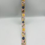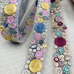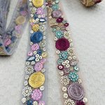 Galon brodé bleu jaune orné de fils colorés et mini sequins dorés. Idéal pour vêtements, sacs ou déco. Existe aussi en mauve vert. Largeur 2,5 cm, longueur 2,5 m. Galon artisanal chic et coloré, parfait pour vos créations couture.