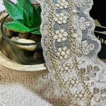 Apportez une touche d’élégance et de lumière à vos créations avec ce galon brodé doré sur fond beige doré.