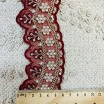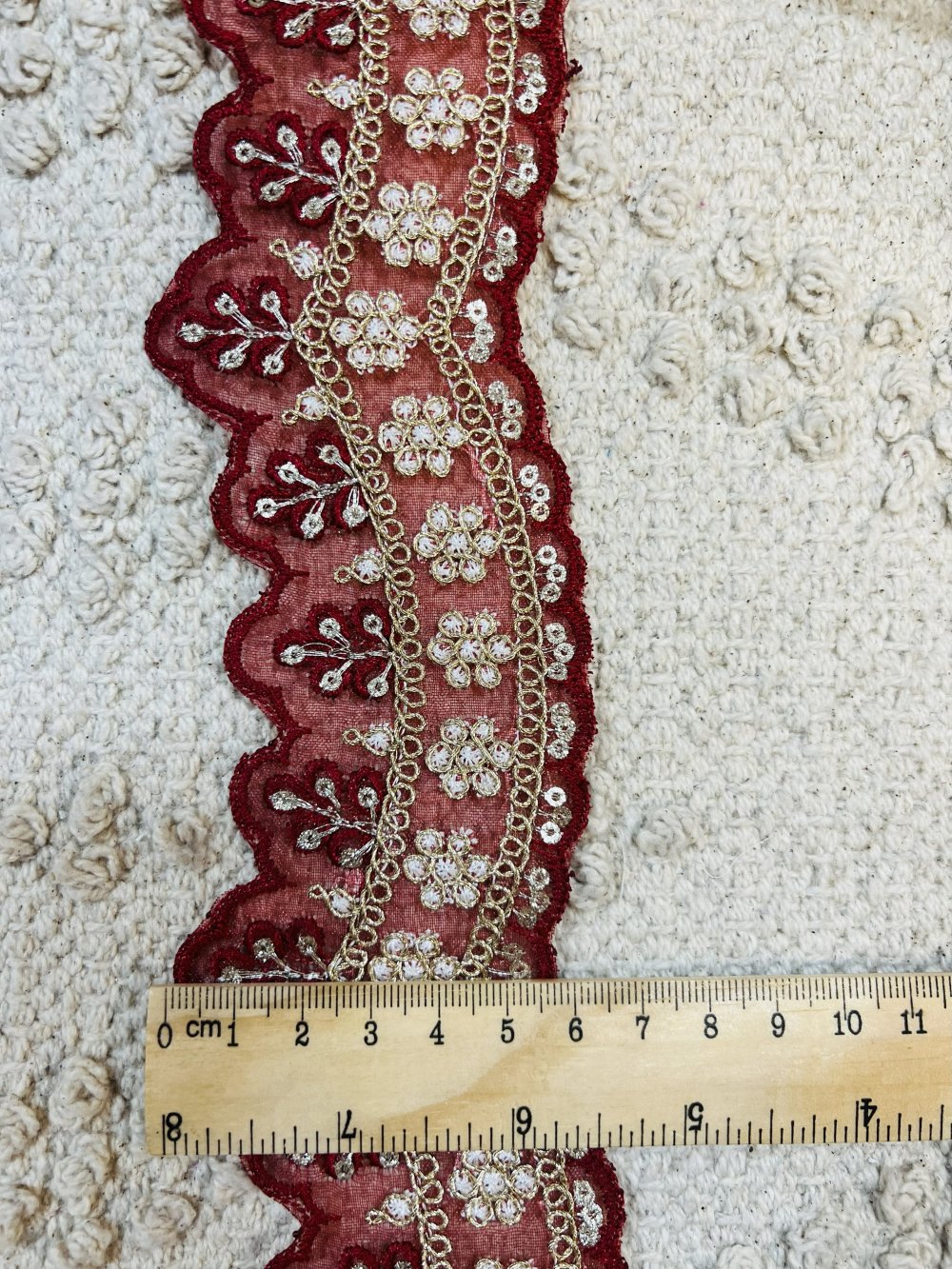 Apportez éclat et raffinement à vos créations avec ce galon brodé doré sur fond rouge, une pièce élégante et lumineuse.