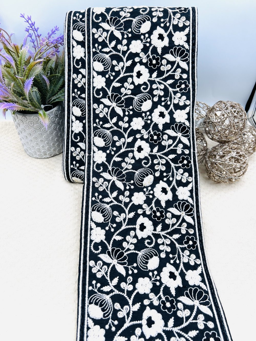 Galon brodé extra-large noir à fleurs ivoire, chic et contrasté pour vos créations couture, déco ou accessoires. Également disponible en bleu intense, turquoise, écru, gris, rose et lavande.