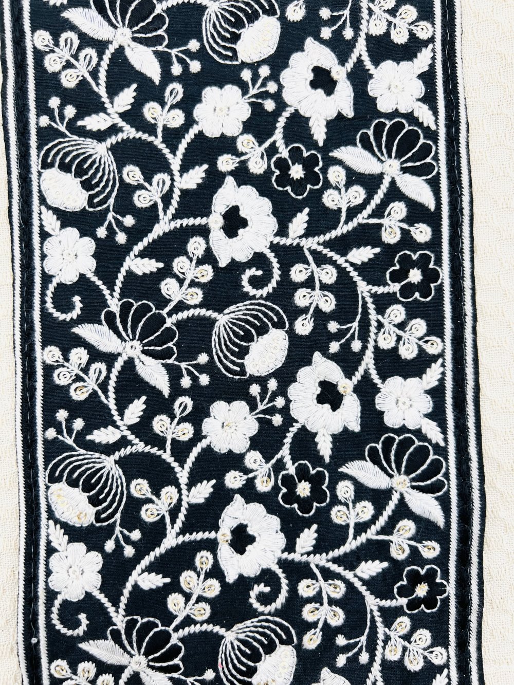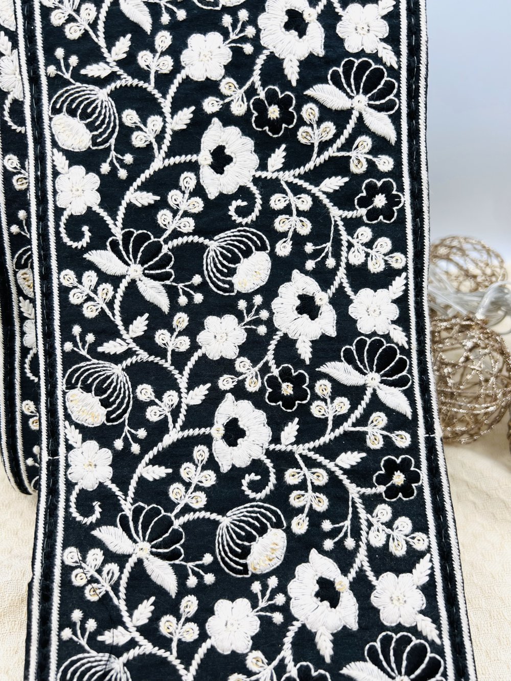 Ce galon brodé extra-large noir à fleurs ivoire allie sobriété et élégance.