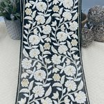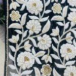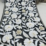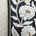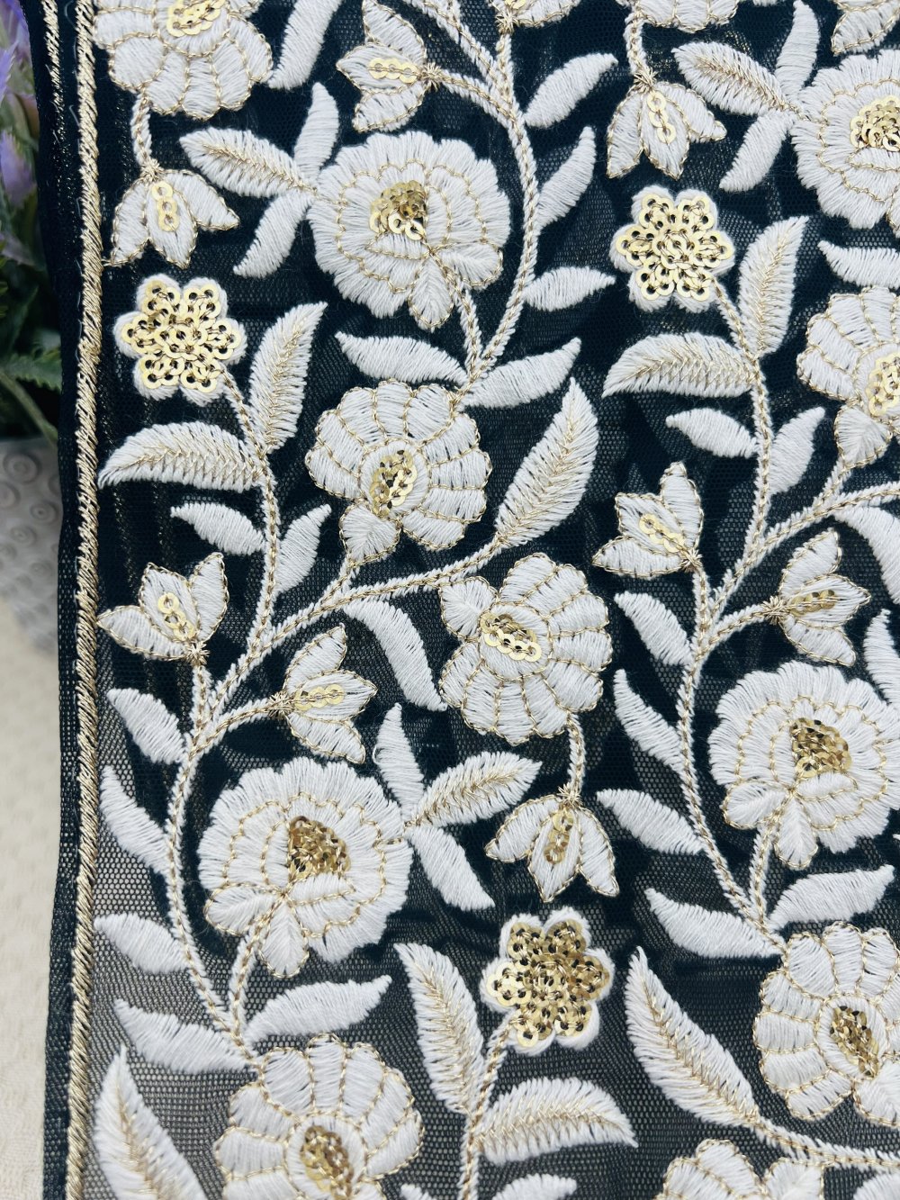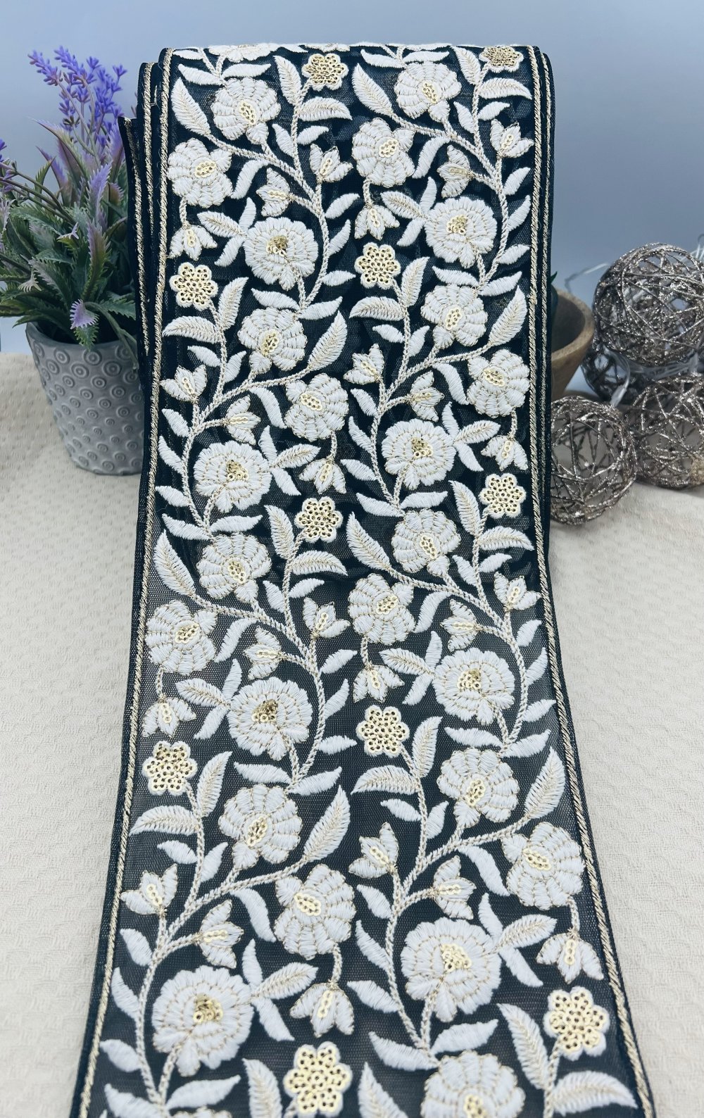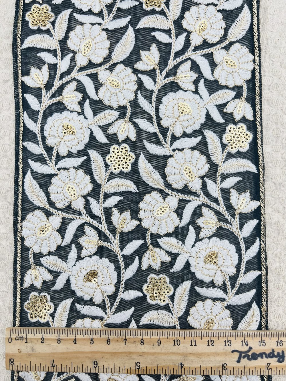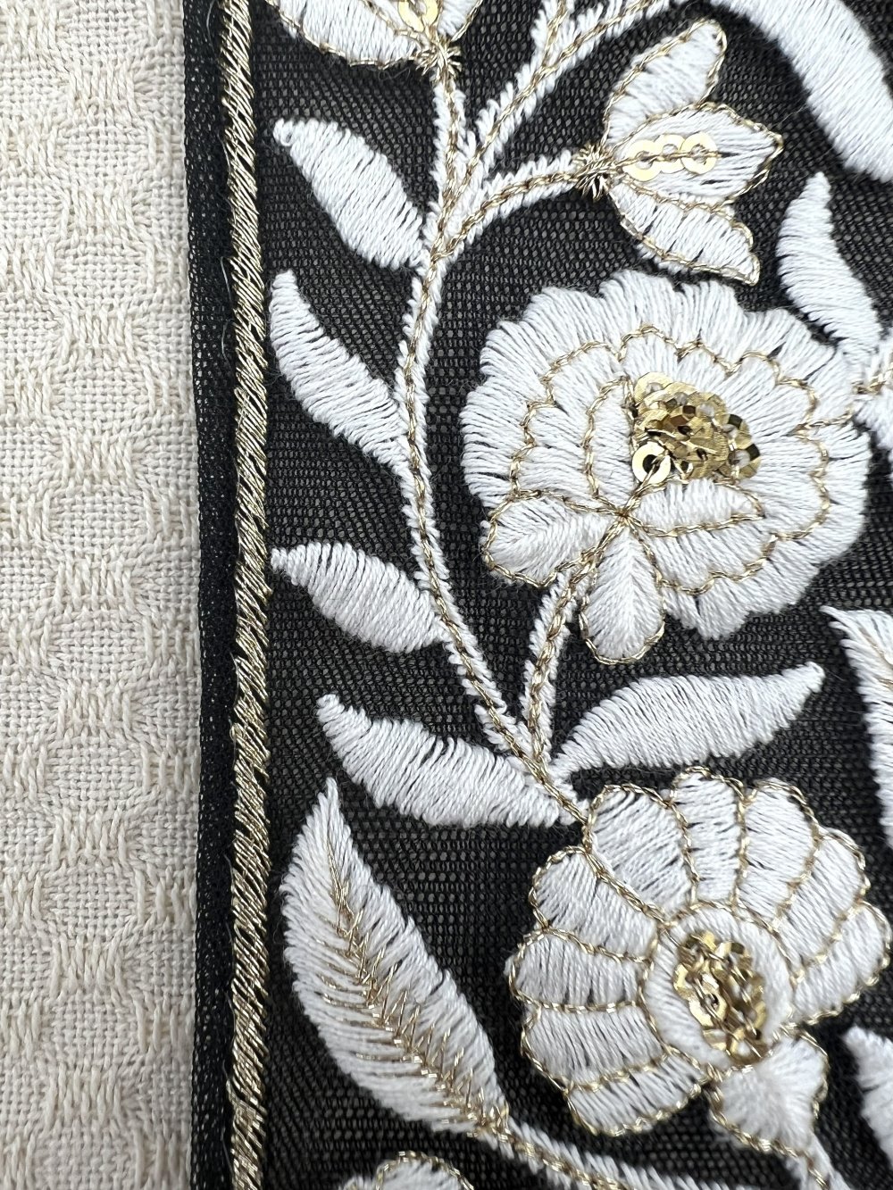 Galon brodé floral blanc et doré sur fond noir transparent, raffiné et lumineux. Parfait pour robes, caftans, kimonos, rideaux ou déco couture. Effet organza fin et délicat pour une finition chic et précieuse sur toutes vos créations textiles.