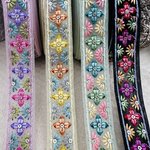 Galon brodé floral multicolore sur fond jaune clair, lumineux et raffiné. Idéal pour couture, customisation ou déco. Largeur 2,5 cm, longueur 2,5 m. Autres coloris disponibles dans la boutique : rose, vert amande et noir.
