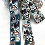 Galon brodé fantaisie beige naturel orné de champignons, fleurs et cœurs colorés. Idéal pour vêtements, accessoires et déco textile. Un galon original et ludique pour vos créations couture et projets DIY. Existe aussi en bleu rétro.