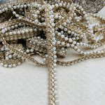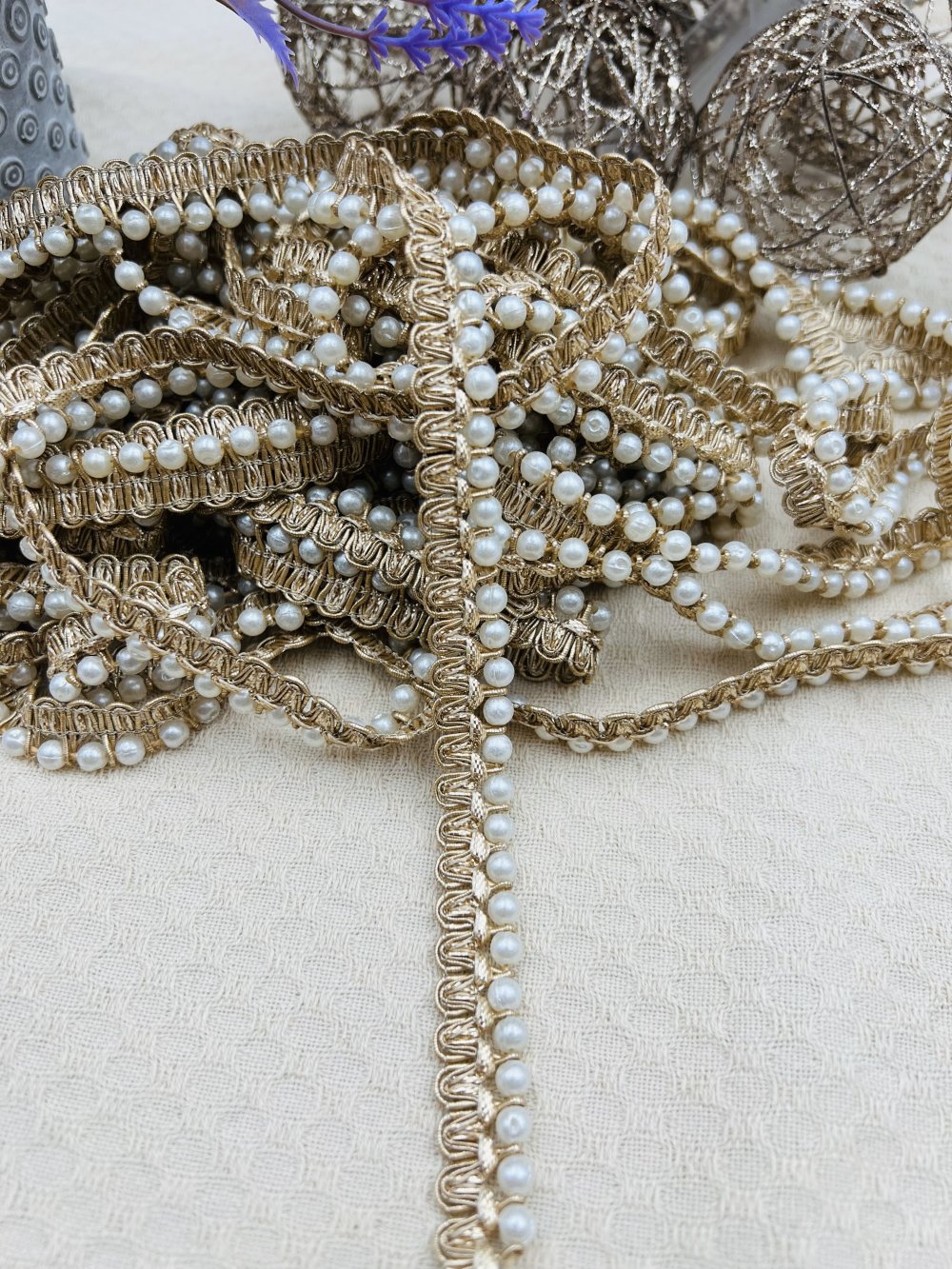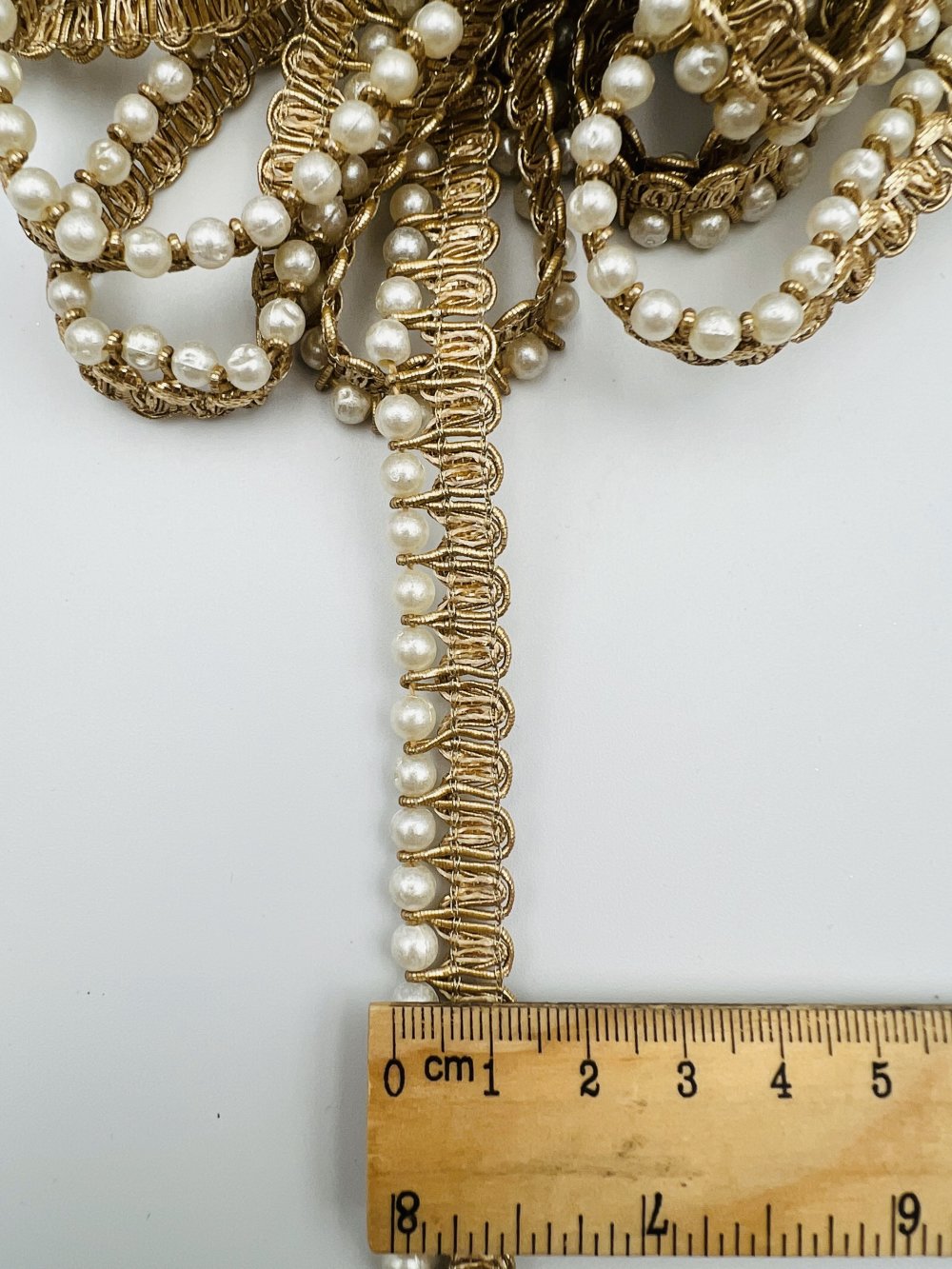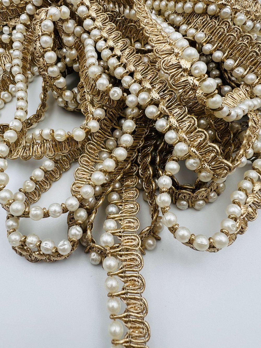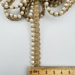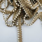 Galon doré à perles nacrées et strass, fin et lumineux, idéal pour sublimer vos créations couture, accessoires ou déco élégante.