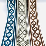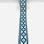 Galon tissé bleu roi à motifs géométriques blancs, éclatant et moderne. Idéal pour vêtements, sacs et déco textile. Existe aussi en vert sauge et marron chocolat. Largeur 5 cm, longueur 2,5 m. Quantité très limitée.