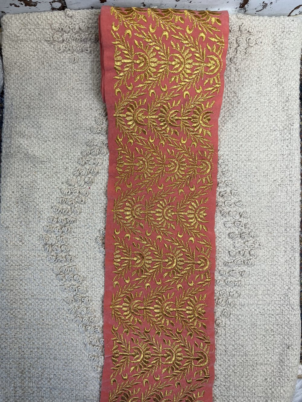 Galon large en velours rose brodé de fils dorés, raffiné et lumineux pour vos créations couture, caftans ou projets déco.