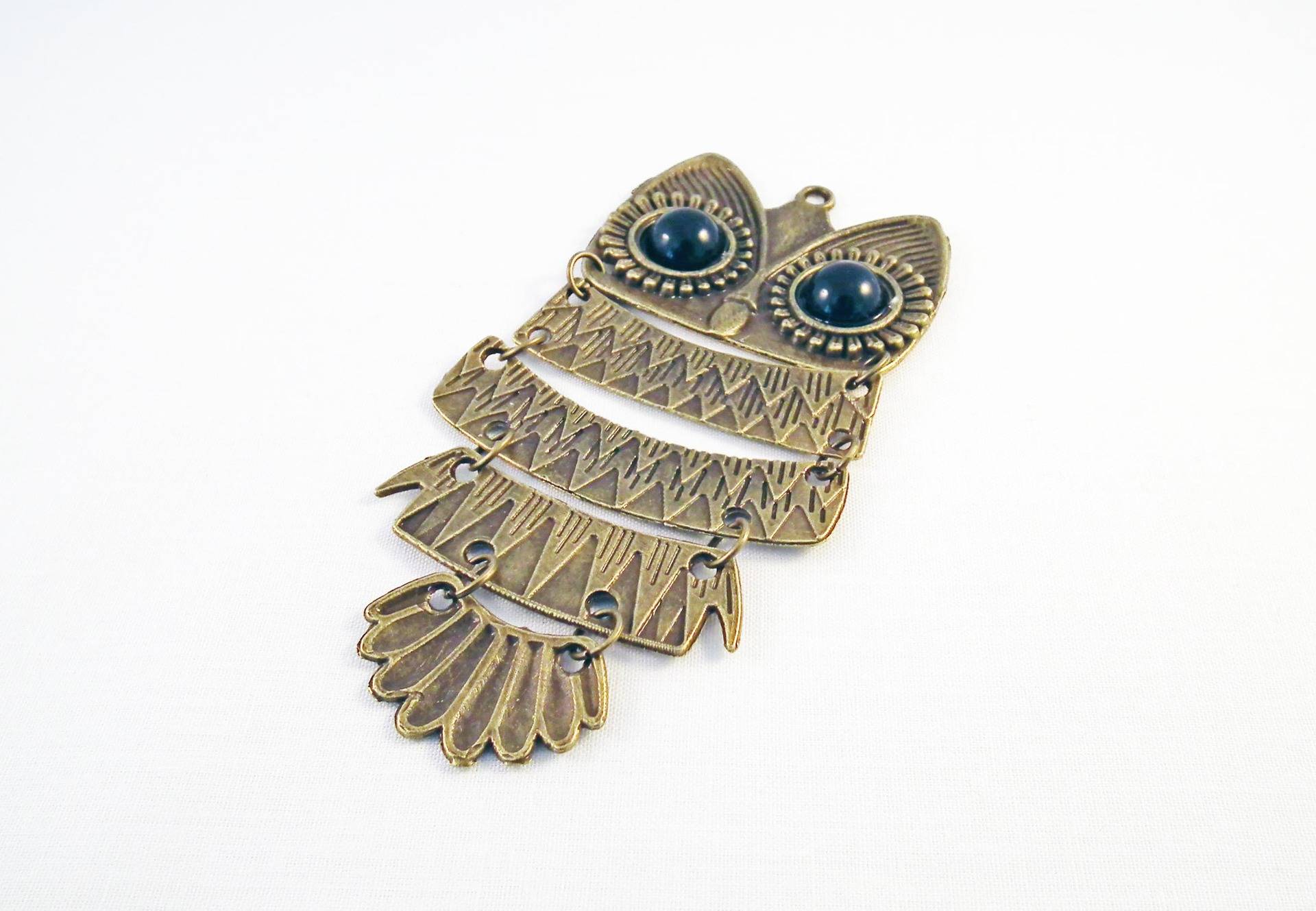 Grande Breloque Pendentif en forme de Hibou à Franges Yeux Cristal Strass Noir de couleur Bronze, 90mm X 45mm.