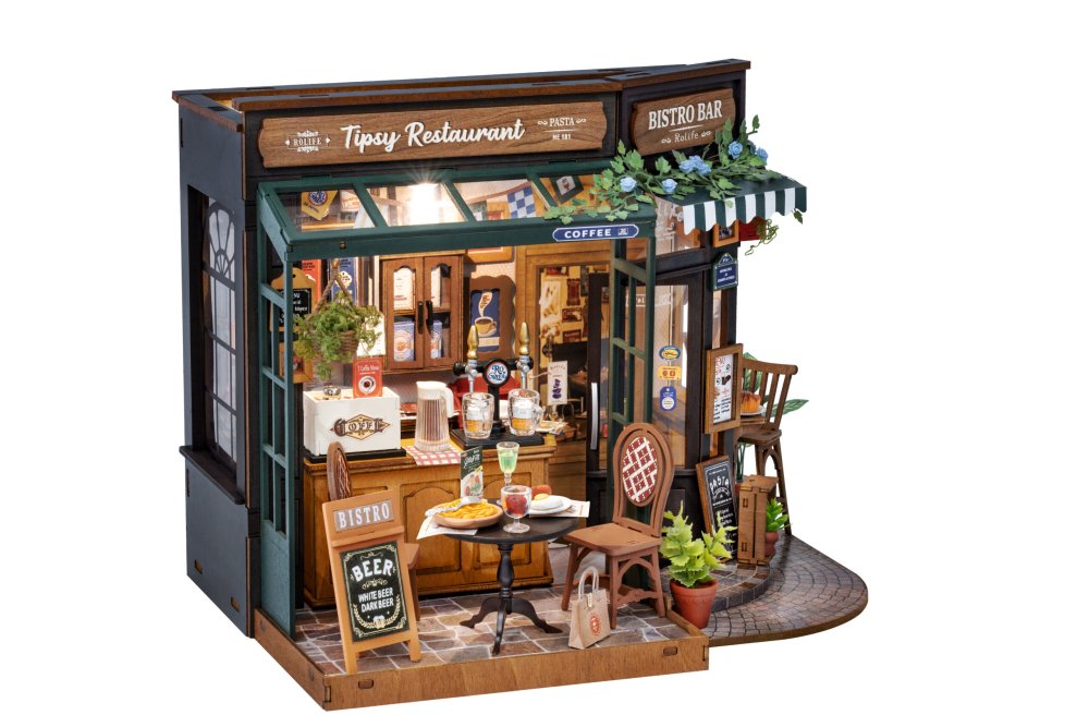 Plongez dans l’univers feutré et accueillant d’un restaurant miniature à l’ambiance cosy et vintage avec le kit DIY Tipsy Restaurant de Rolife.