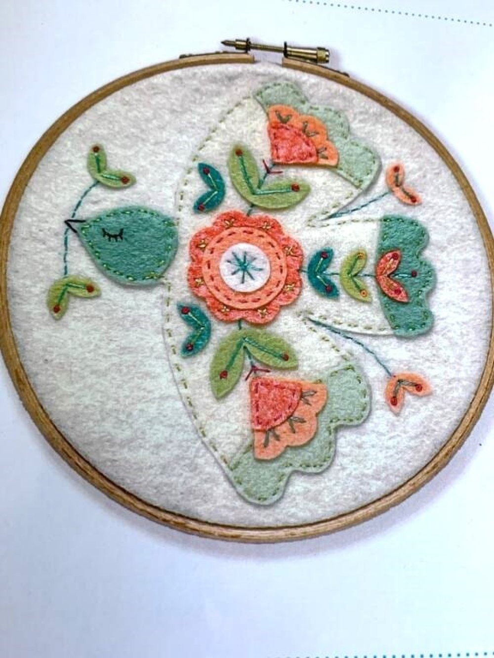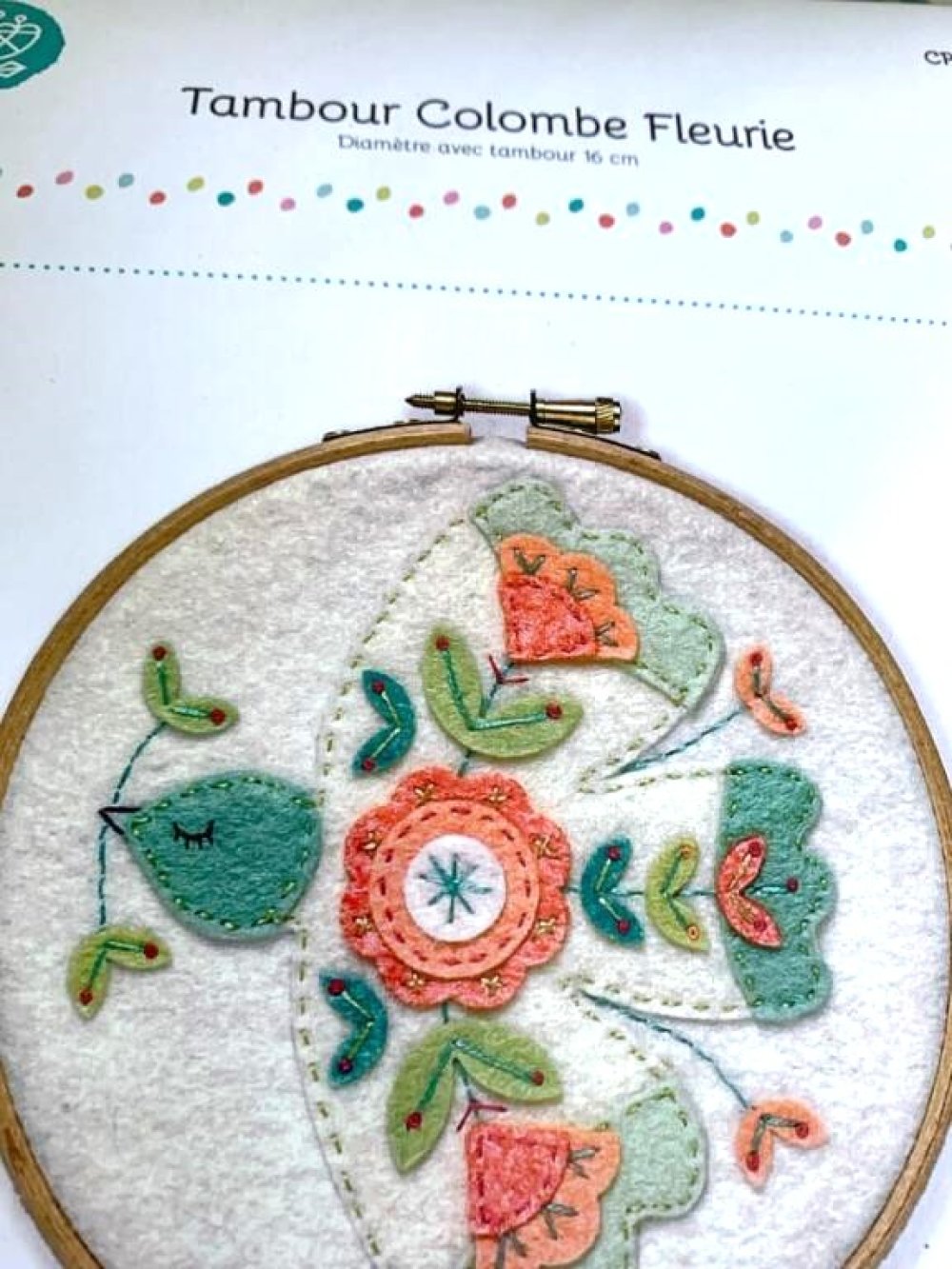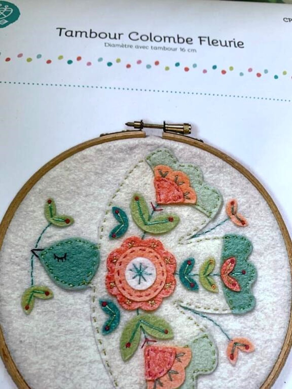 Modèle en feutrine facile à découper et à assembler, embelli de broderies simples façon folk art. Diamètre du modèle encadré 16 cm environ.