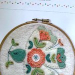 Notre colombe est habillée de feuilles et de fleurs folk art brodées et elle est présentée dans un tambour à broder, façon Hoop Art.