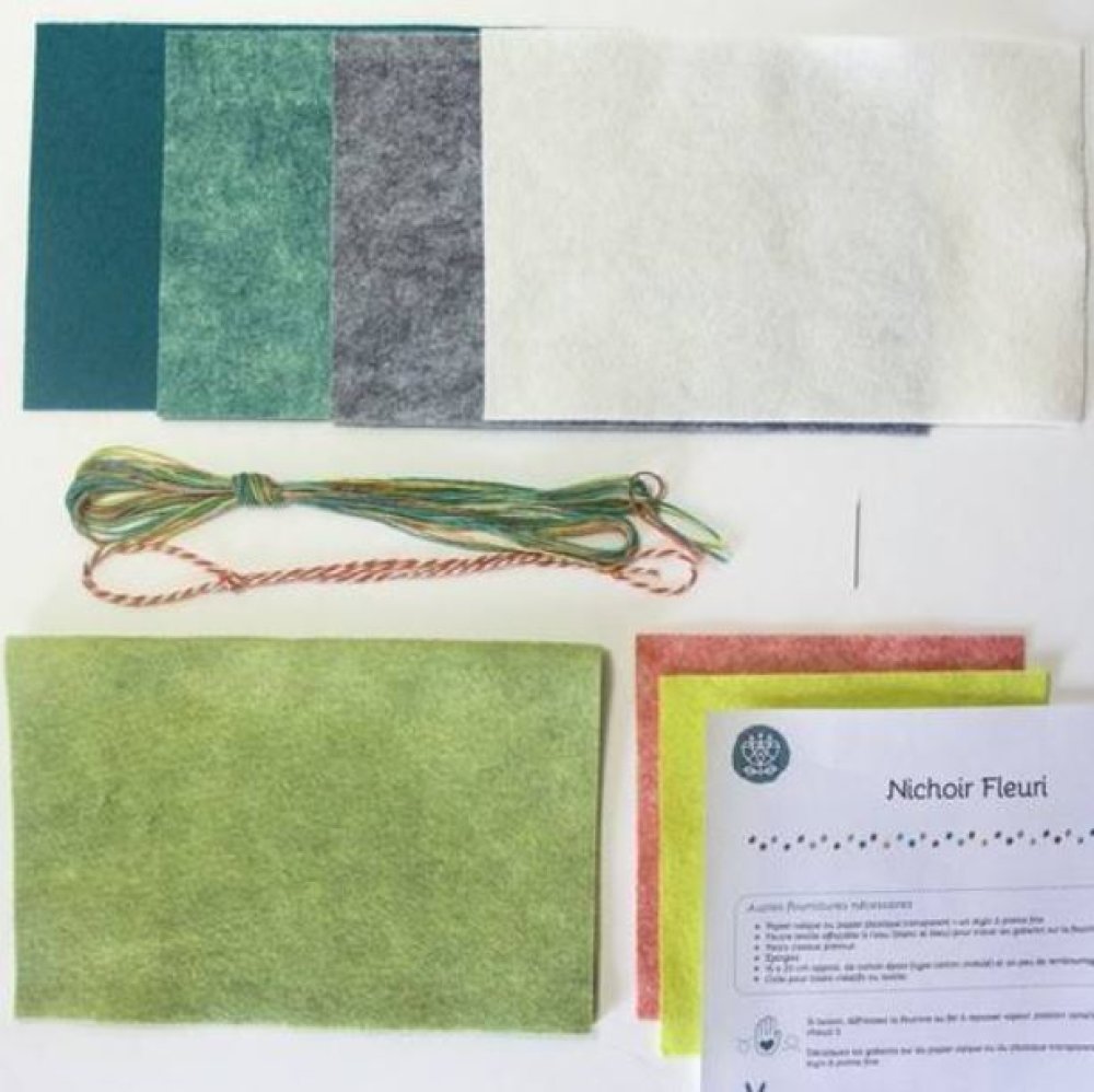 Le kit comprend 7 coloris de feutrine, l'aiguille, les fils à broder, le baker's twine, les explications et gabarits détaillés.