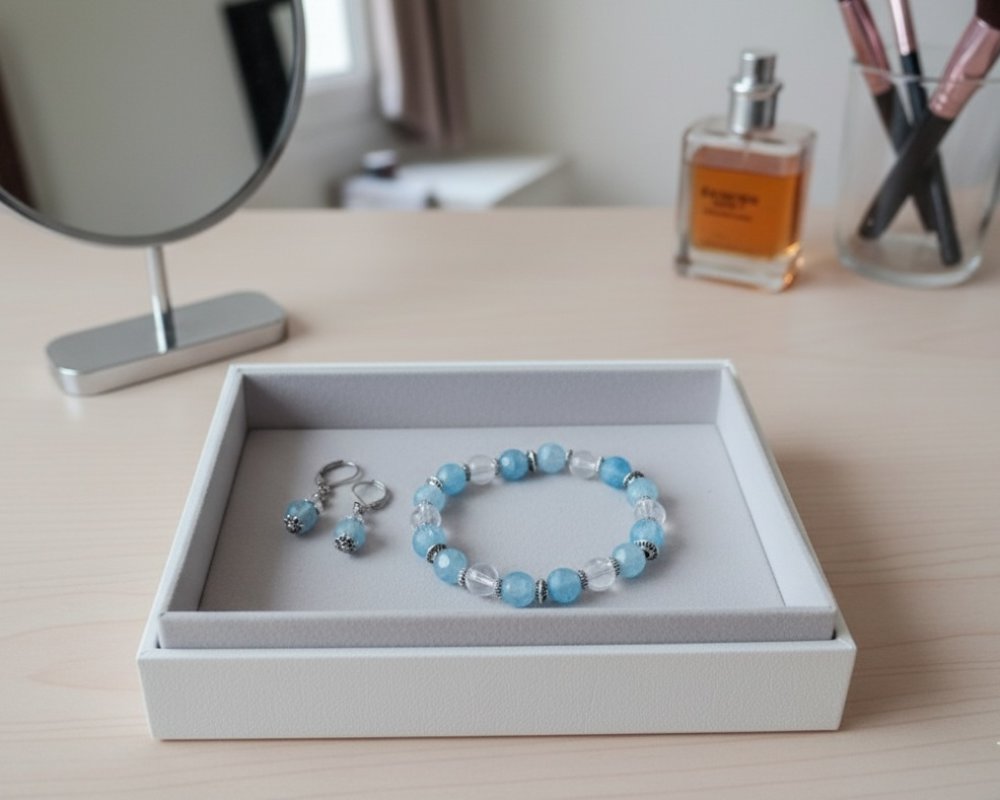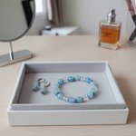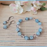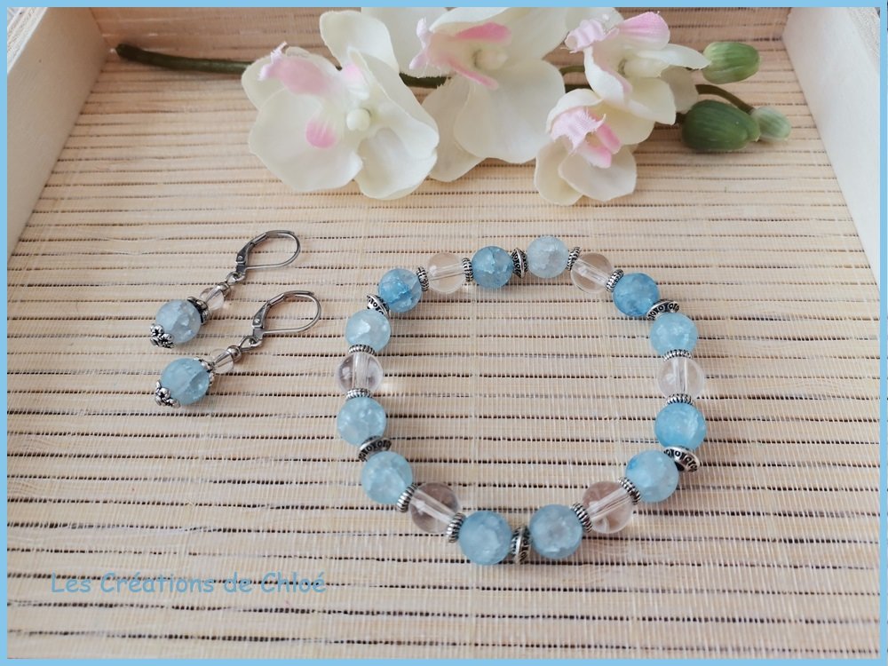 - Bracelet : 12 perles en verre craquelé de couleur bleu ciel de 8 mm, 6 perles en verre cristal ronde de 8 mm, 6 perles disque 6 mm, 12 perles métal intercalaire 4 mm argent mat