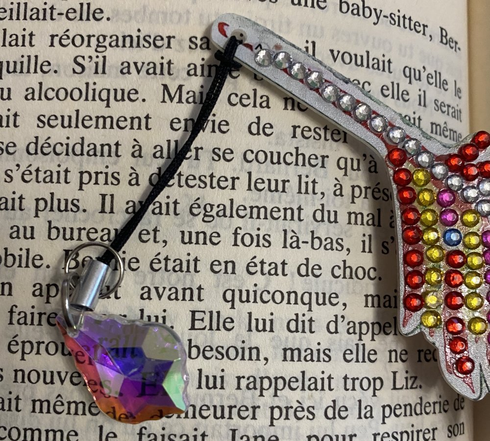 Chaque diamant a été posé avec soin pour créer un motif vibrant multicolore évoquant la fantaisie, la créativité et le plaisir de lire. Le pendentif cristal, accroché à une fine cordelette noire, ajoute une touche de délicatesse supplémentaire et permet de repérer votre page en un instant.