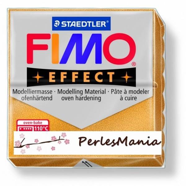 Loisirs créatifs: 1 pain 56g pate polymère FIMO EFFECT OR REF 11 La pâte Fimo SOFT se décline en 24 couleurs différentes Chaque pain de 57 gr (dimensions : 5.5x5.5x1.5 cm) est divisé en 8 segments que vous pouvez facilement découper. À cuire dans un four à 110 degrés pendant 30 minutes. Réalisez de nombreuses créations grâce à cette pâte à modeler : bracelets, colliers, objets décoratifs... Vous trouverez dans notre boutique perles et apprets necessaires pour la fabrication de bijoux fantaisie