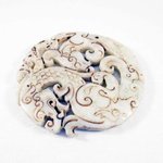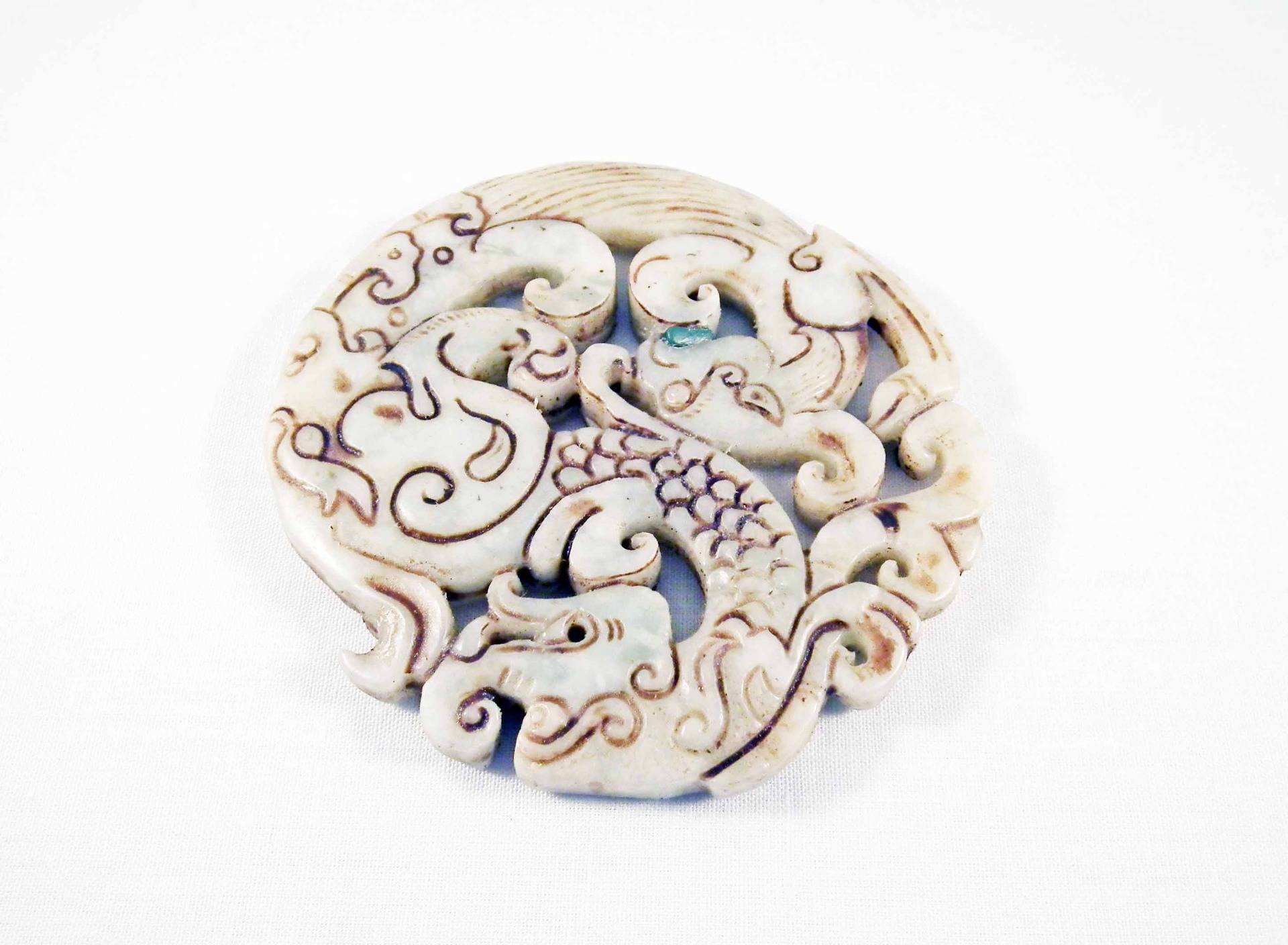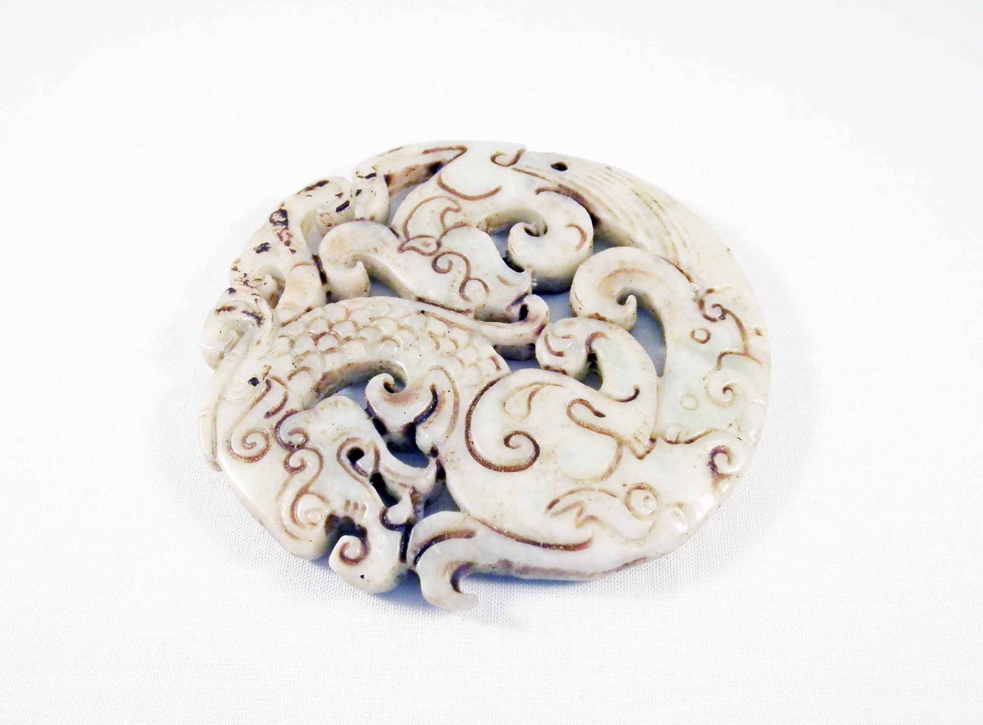 Magnifique Grande Breloque Pendentif en Jade Blanc à Motifs anciens Asiatiques Dragon Poisson