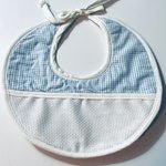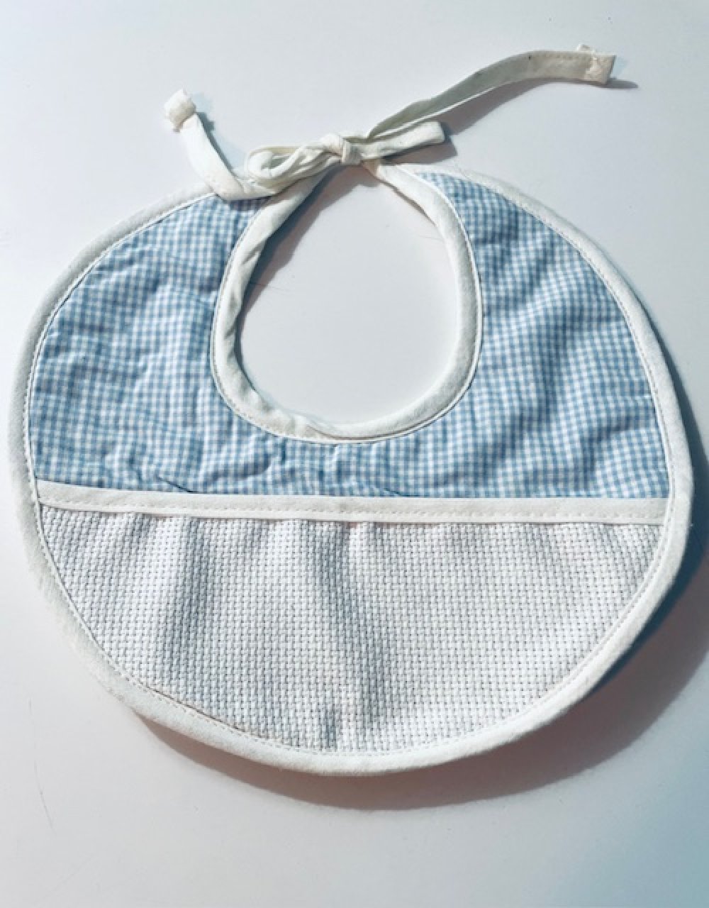 Bavoir rond en coton blanc et vichy bleu avec bande de toile aïda à broder