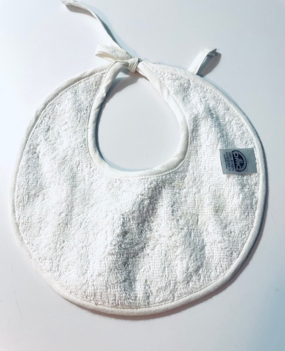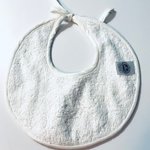 Bavoir éponge blanche avec coton vichy bleu ciel, une bande aïda à broder bordé de biais blanc. 100% coton. Non doublé. Diamètre : 20cm