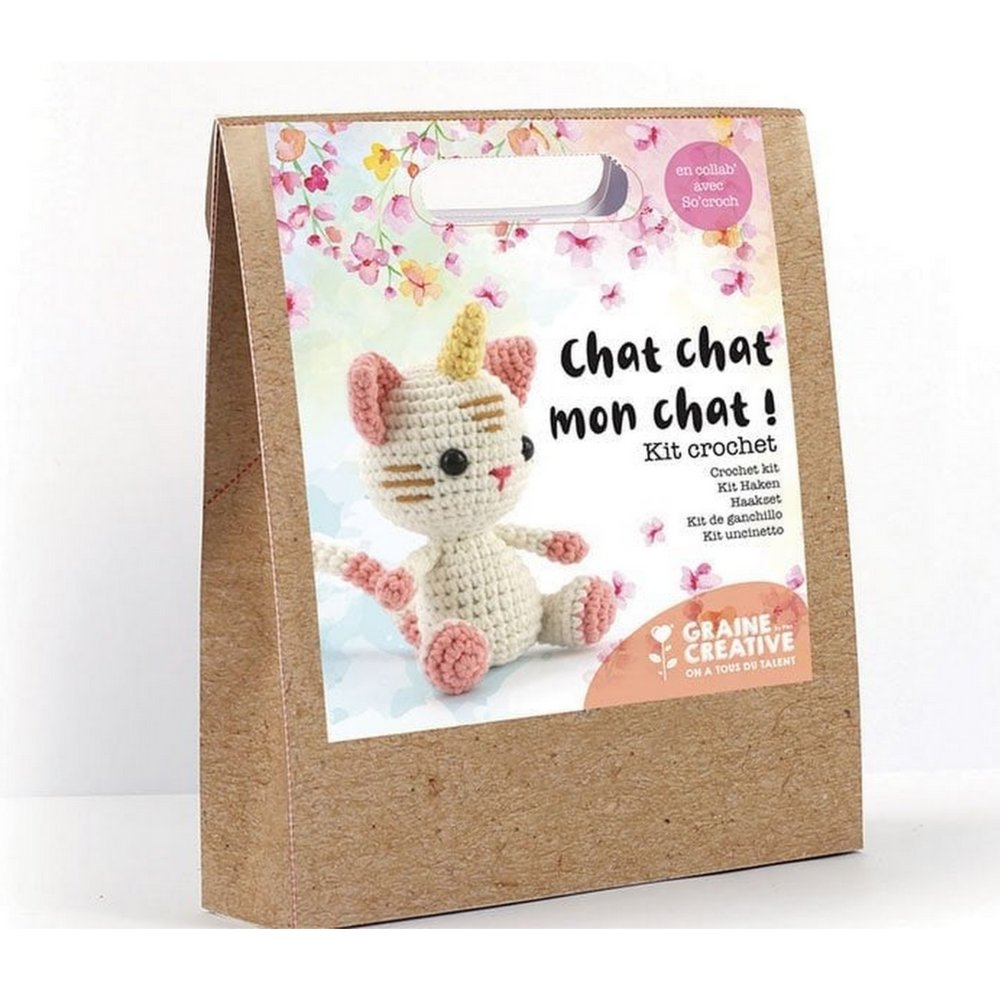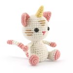 Ce kit complet contient tout le nécessaire pour crocheter un chat licorne unique, aux couleurs pastel (blanc, rose et nuances délicates).