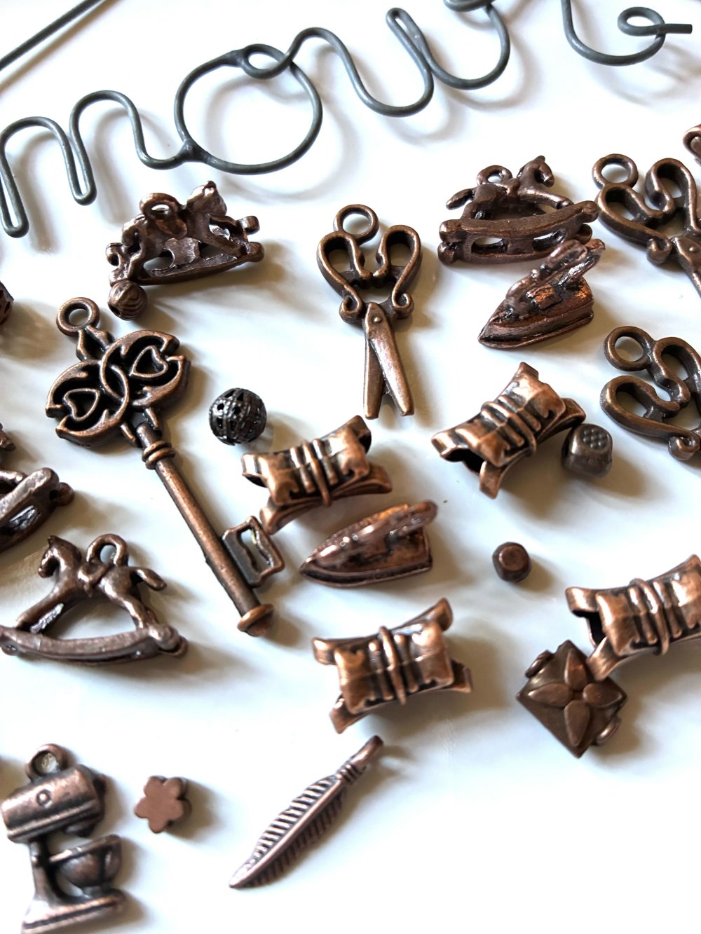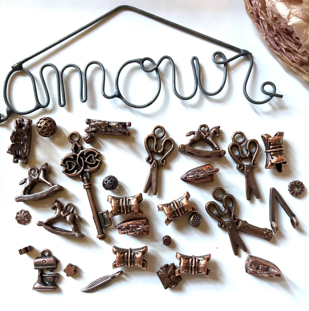 Ce lot est composé de 30 perles en métal couleur cuivre, formes variées (cheval à bascule, coupelles, bélières, feuilles, clef, ciseaux, ), de 5mm à 20mm