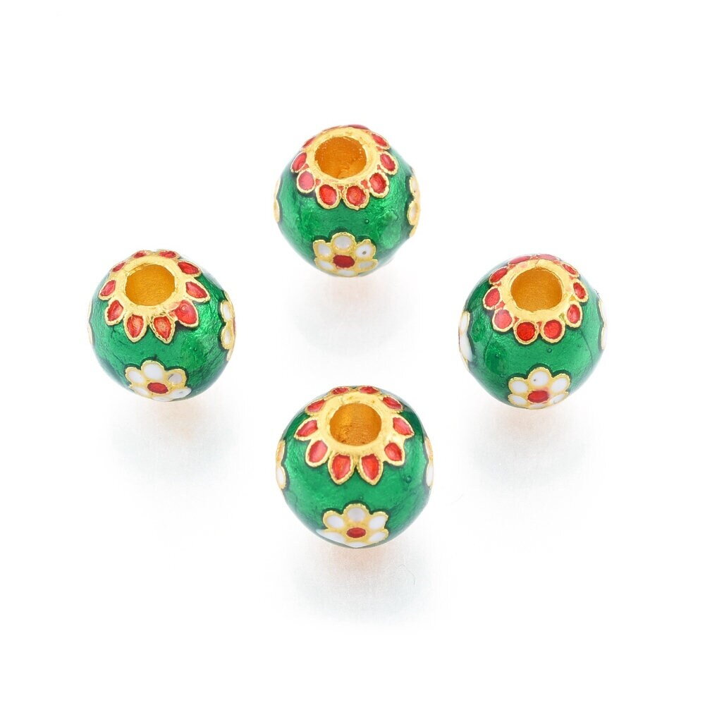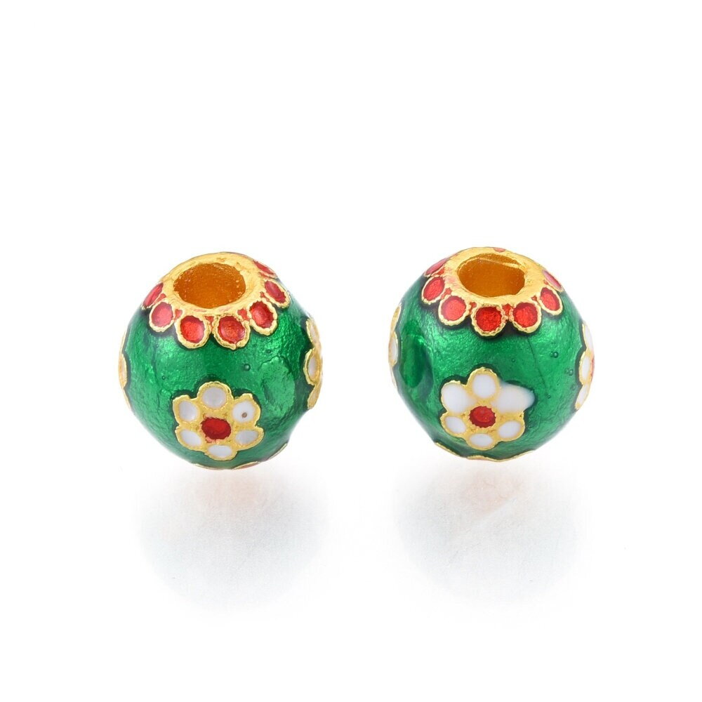 Perle doré mat email vert, rouge , blanc , fleur en email Blanc