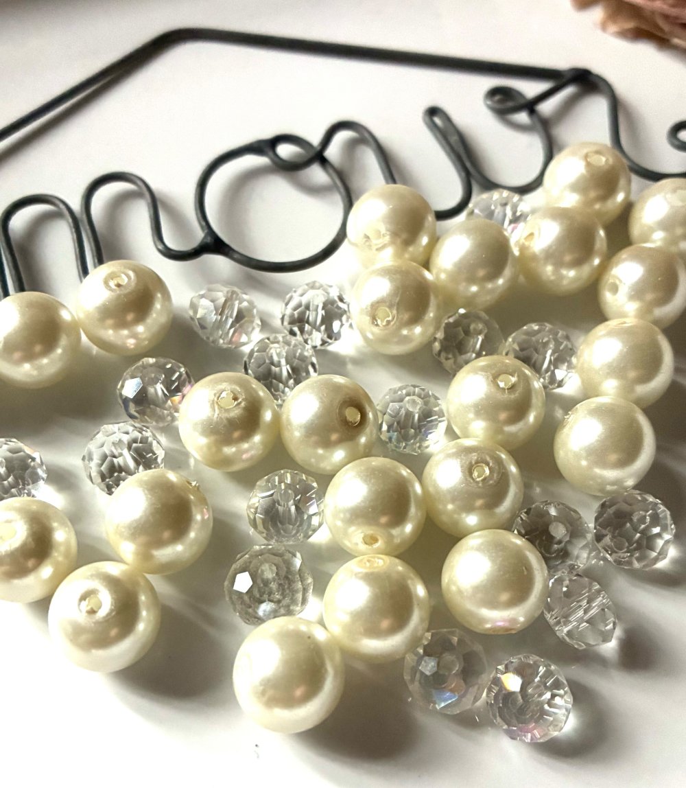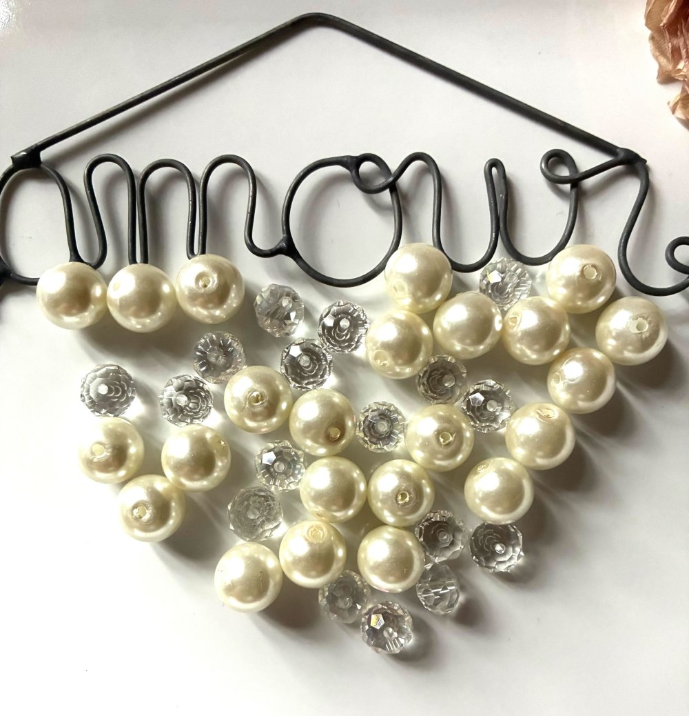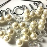 Ce lot est composé de 23 perles rondes blanches en nacre (10mm) et 17 perles facettées transparentes en cristal (7mm).