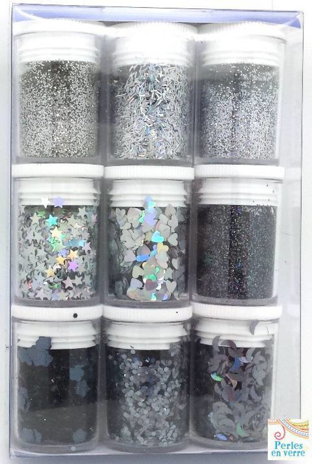Lot de 9 tubes de paillettes (noir, gris, argent). Assortiment de 9 forme différentes: cœurs, lunes, fleurs, étoiles, ronds... Paillettes idéales pour remplir dôme, bague, globe en verre... ou pour Fimo, déco, scrapbooking...