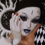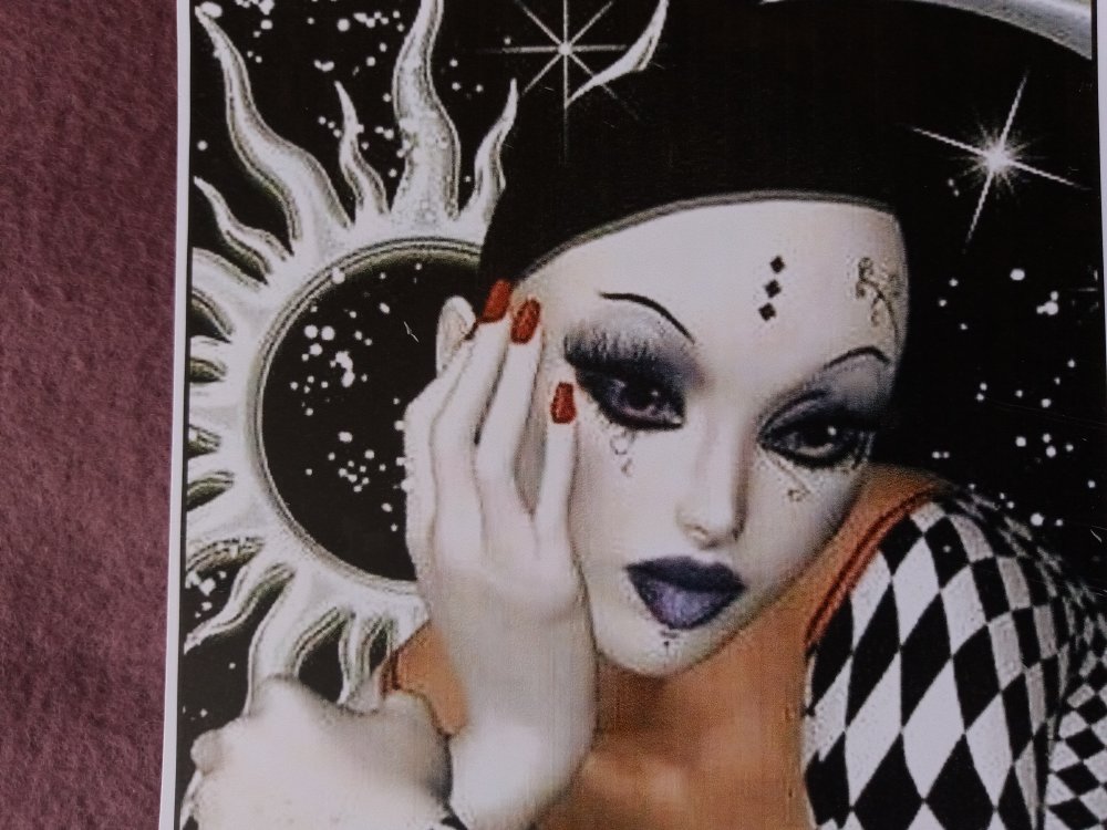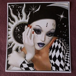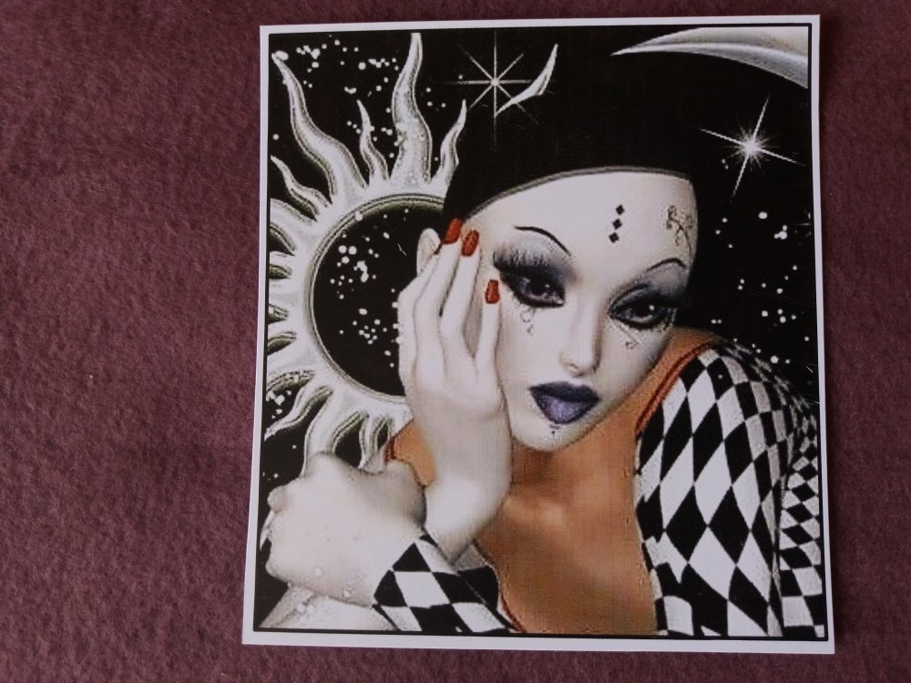 Jolie représentation d'un Pierrot, un Pierrot réveur et pensif, devant un ciel noir avec soleil et étoiles. L'image est imprimée sur du papier photo brillant 260 g.