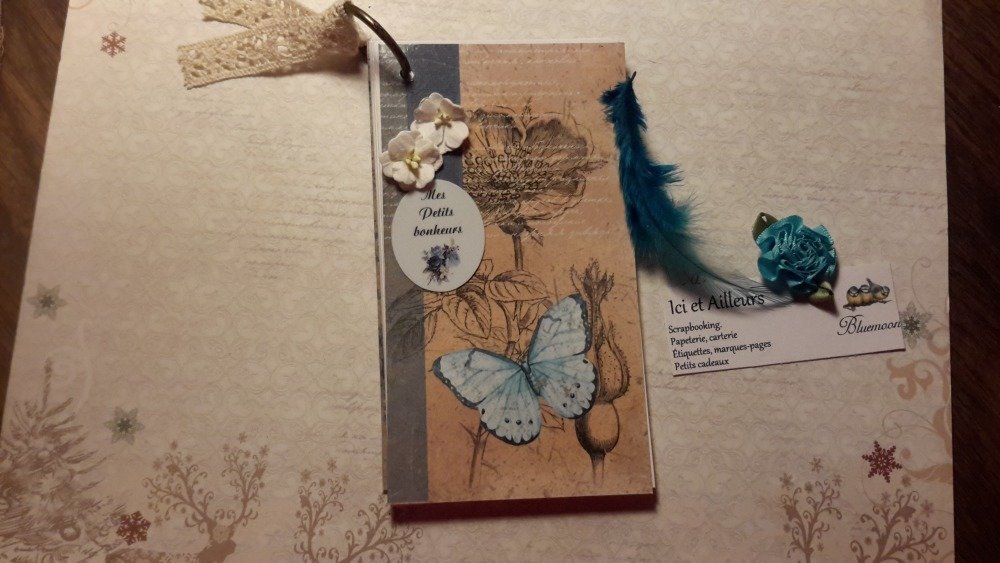 Petit carnet, bloc notes, petit livre à pensées, mémo, pense bête, herbier, petit album scrapbooking, souvenirs.. Fleurs, embellissements métal, mot bonheur, bleu ciel, kraft. Papeterie, loisirs créatifs