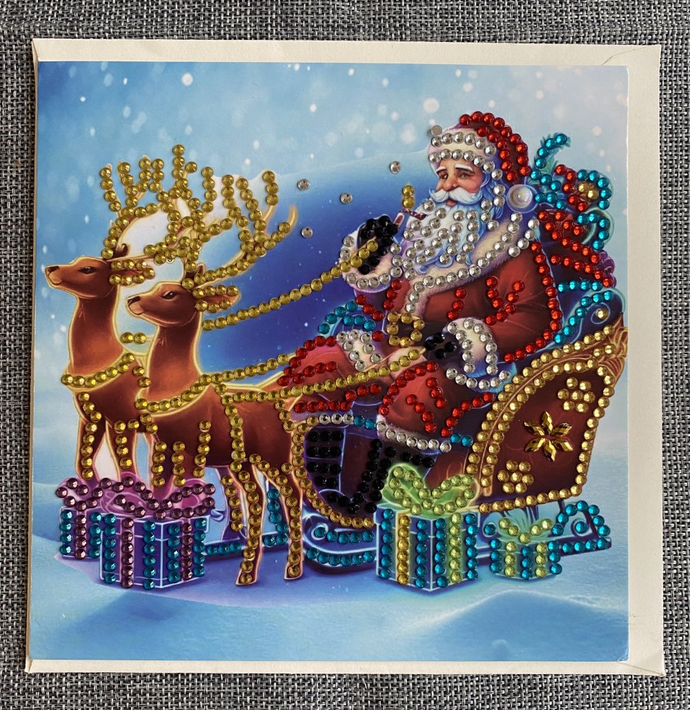 CARTE DE NOEL "TRAINEAU MAGIQUE DE NOEL" EN DIAMOND PAINTING AVEC ENVELOPPE, PERE NOEL SUR SON TRAINEAU, STRASS, CARTE SCINTILLANTE,