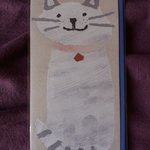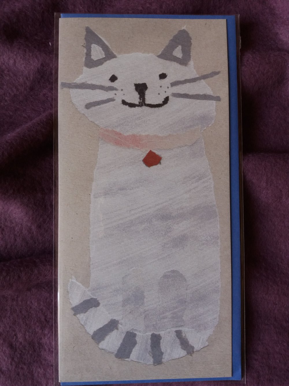 Jolie carte double, sans texte, avec représentation graphique moderne d'un chat rigolo, dans les tons beiges.