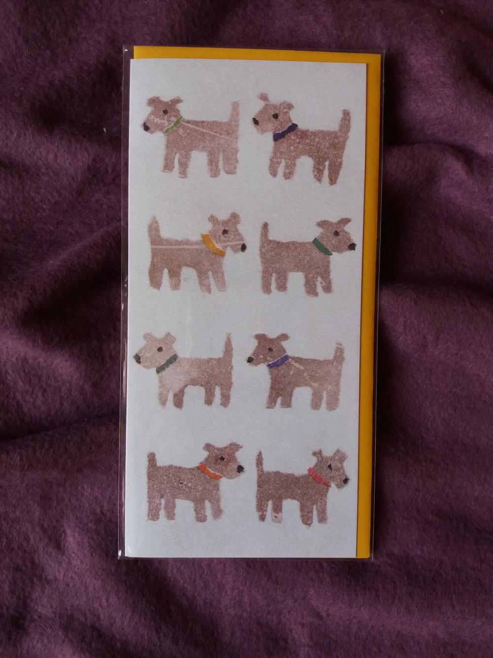 Jolie carte double, sans texte, avec représentation graphique moderne de chiens, dans les tons beiges.