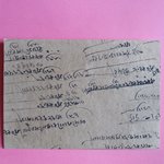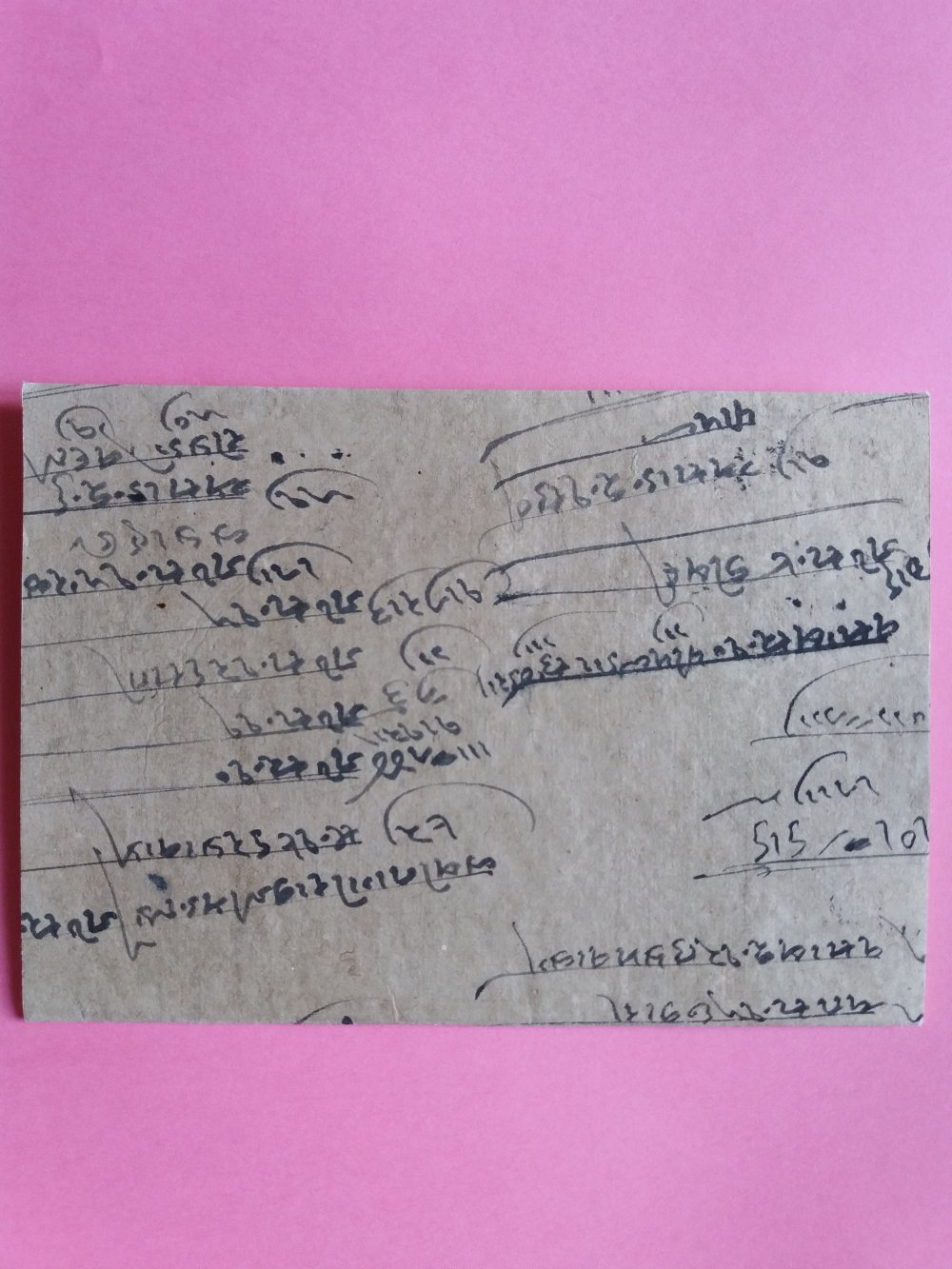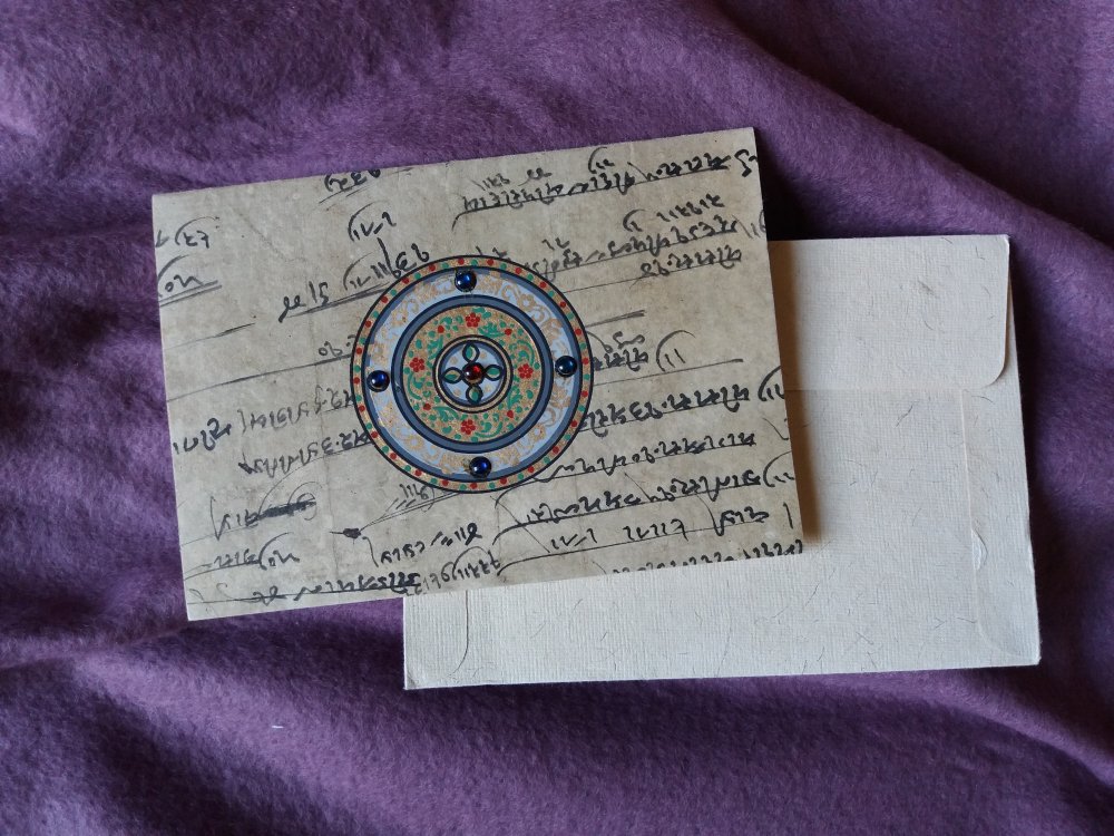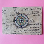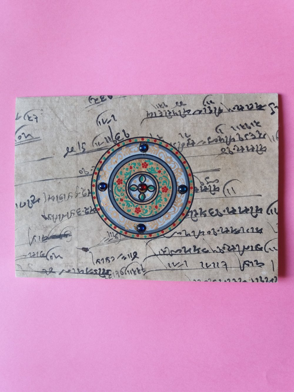 Recto et verso avec inscriptionss encre noire. Sur le recto motif central rond avec dorures et dem-perles.