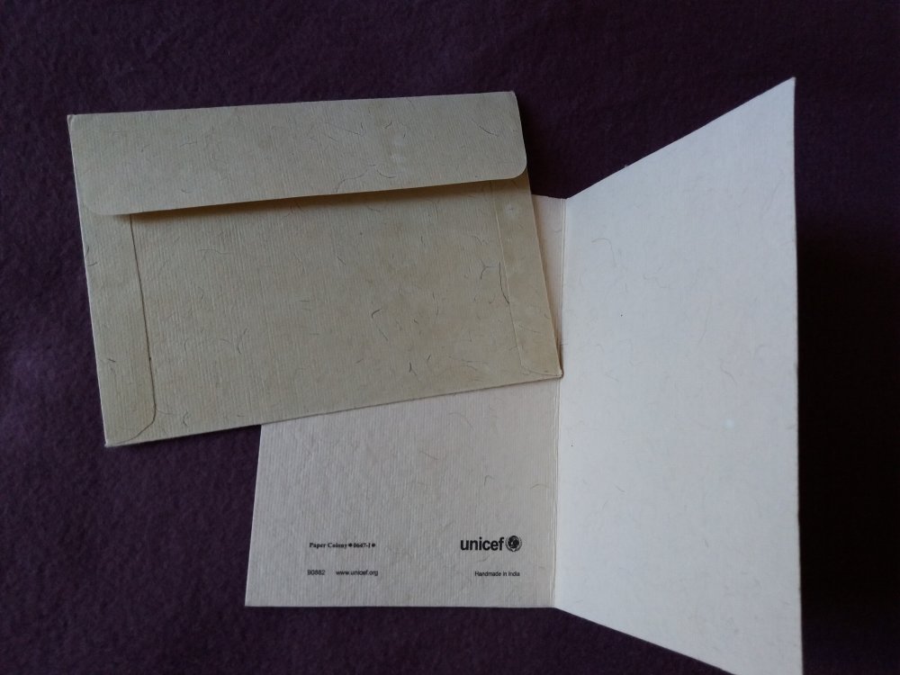 Jolie carte Unicef, sans texte, format 15,5 cm x 11 cm, imprimée sur beau paier traité naturel épais (paper colony), couleur beige.
