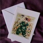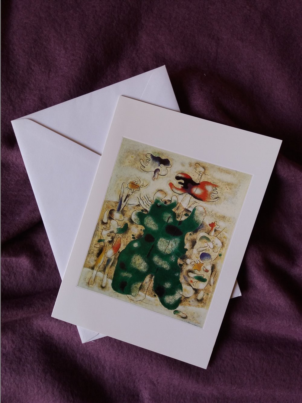 Carte Unicef, sans texte, format 19,5 cm x 13,7 cm, illustration moderne et colorée "Formes aux prédominances rouge et verte", intérieur blanc.