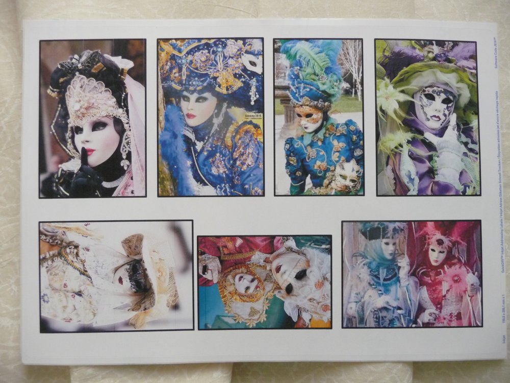 Planche adhésive de vignettes avec magnifiques illustrations de masques vénitiens, pour un univers envoûtant et mystérieux.