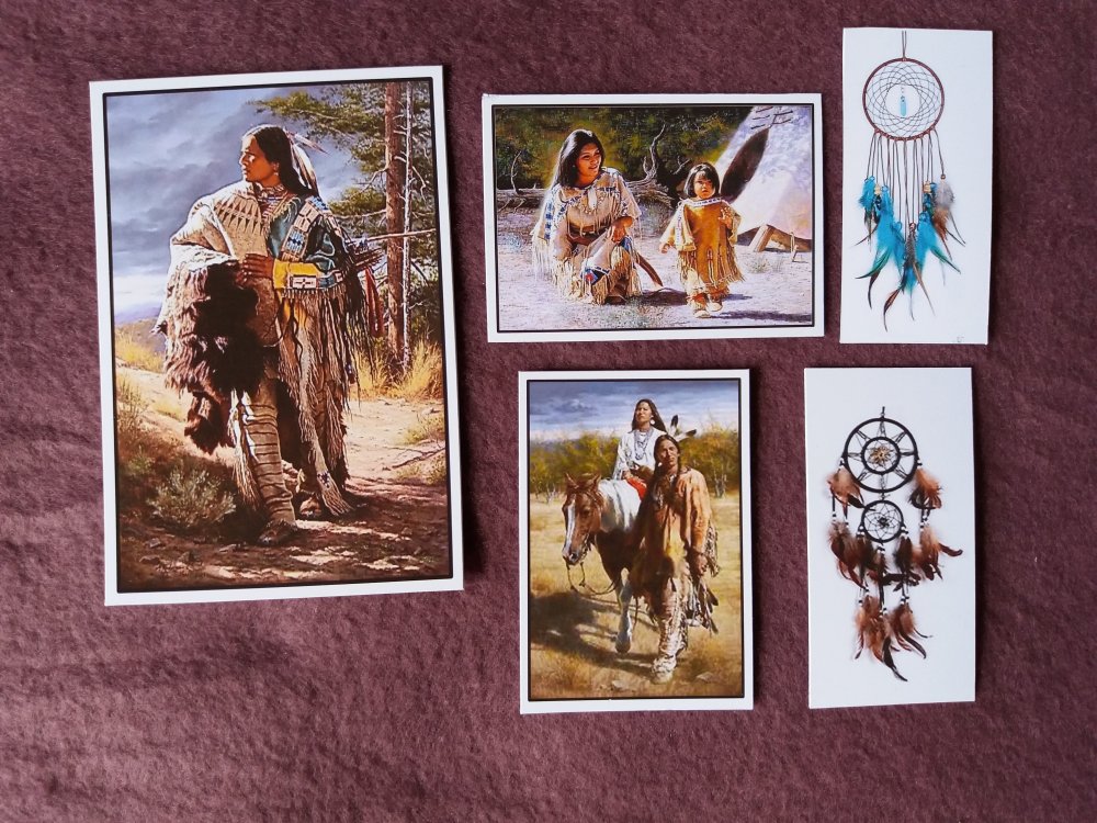 Ensemble de 5 petites images représentations d'indiens et capteurs de rêve
