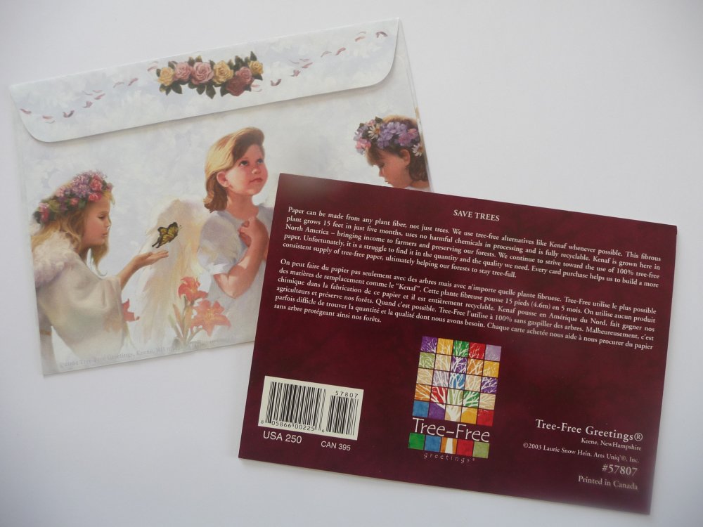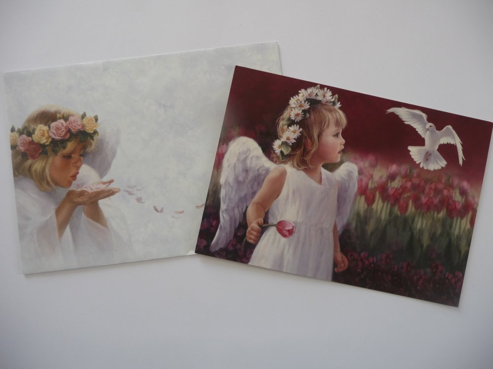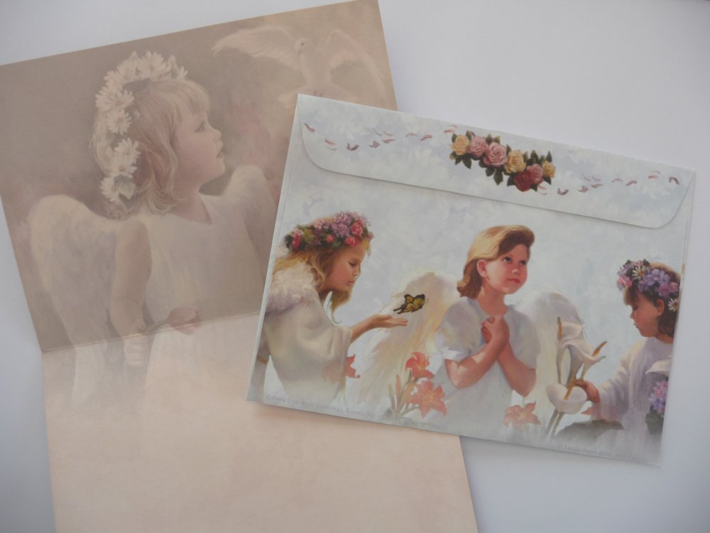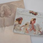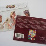 La carte est accompagnée de sa ravissante enveloppe illustrée (petits anges et fleurs).