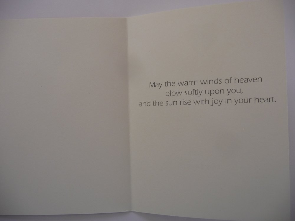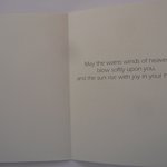 Texte en anglais à l'intérieur de la carte "May the warm winds of heaven blow softly upon you, and the susn rise with joy in your heart"