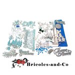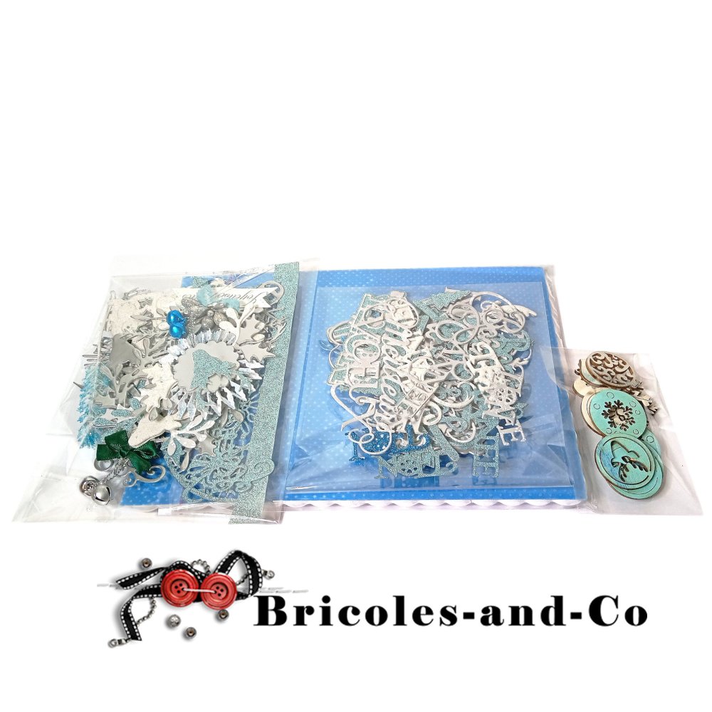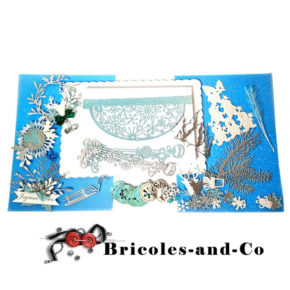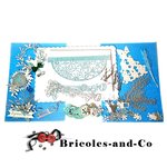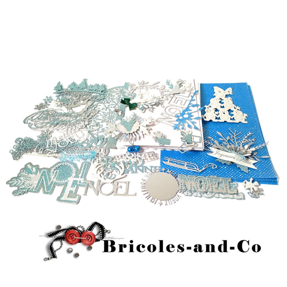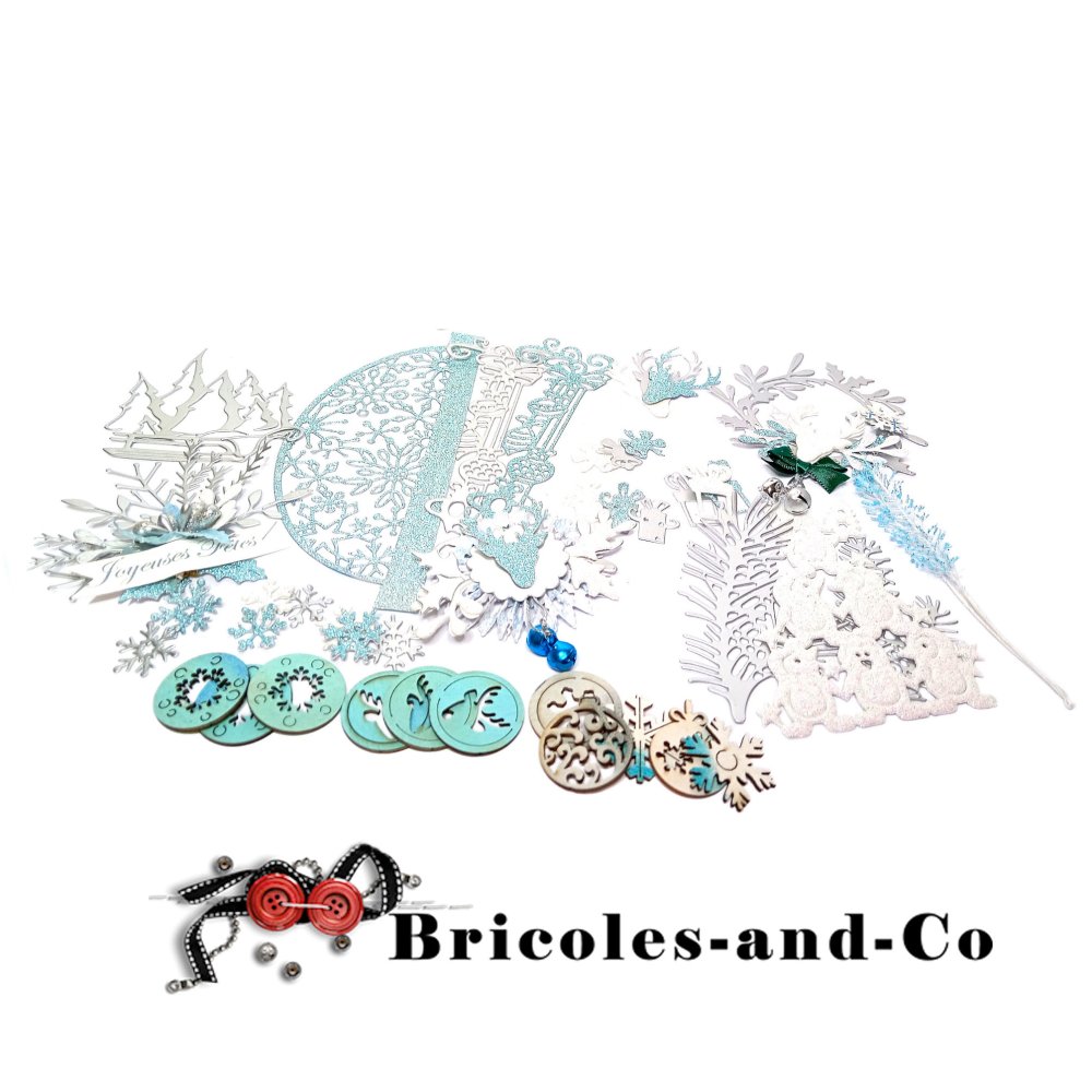 Déco :-1/2 cercle flocons bleu paillettes sticker larg. 6,5cm haut.14cm,2 boules coin 13.5cmx4cm,2 branches pin grande 10cmx5cm Pt 7cmx4cm,1 Pingouin pyramide mousse blanche stickers 9,5cm x7,5cm,1 traineau 7cmx 1,5cm , 1 sapin fin, 1 rosette tête de renne 6cm, 1 branchage étiquette , 1 branchage rond grelot , 3 petits flocons, 1 cloche petite, 2 cadeaux petit, 1 tête renne