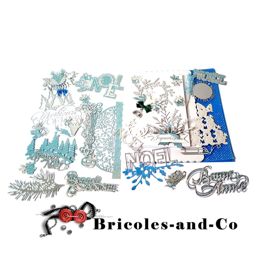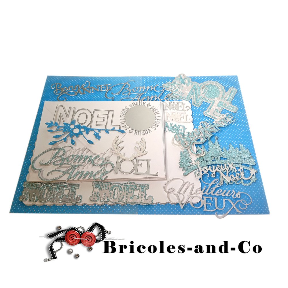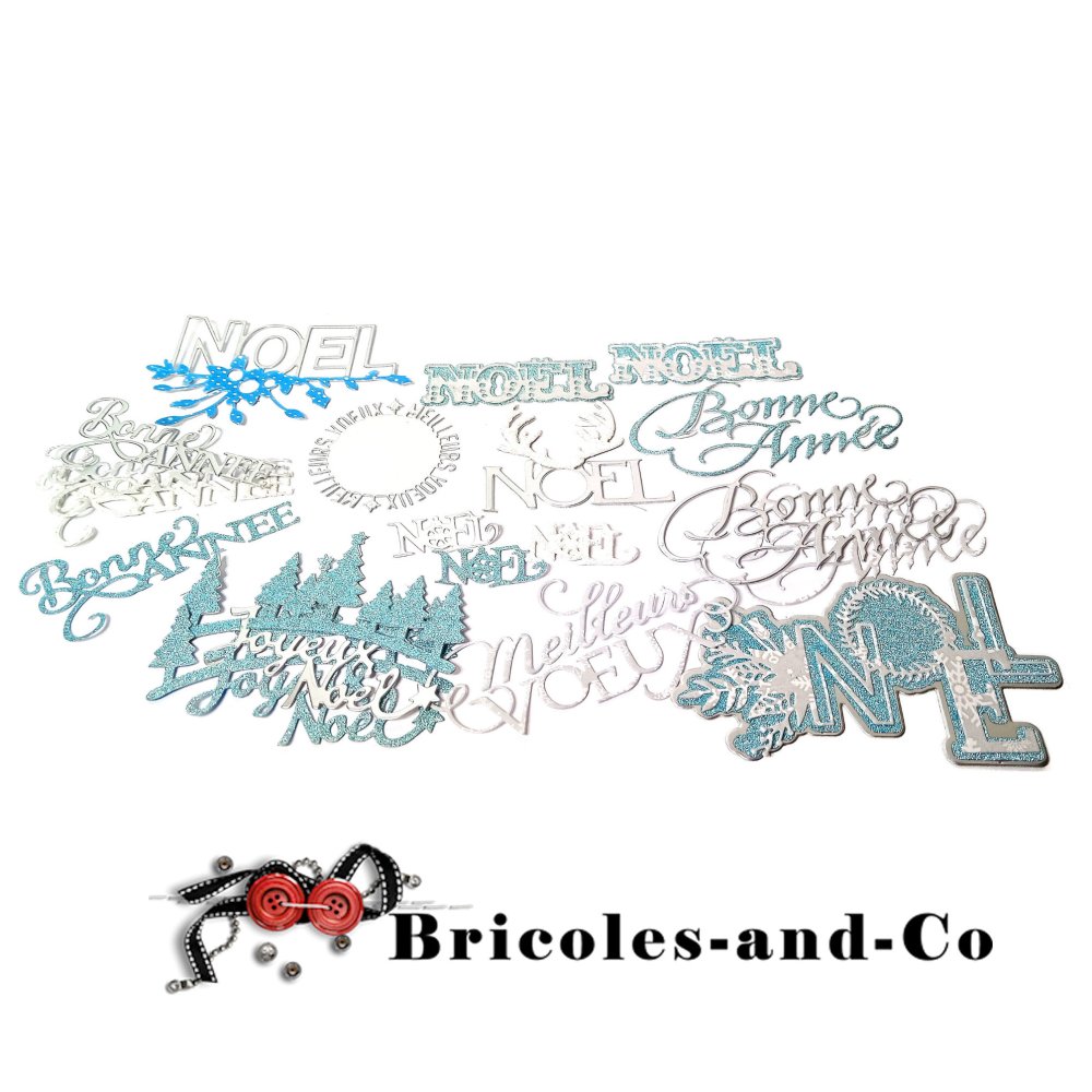 texte : 1 Noel (triple couleur)11cmx7cm, 2 noël (2couches) 7cmx2cm, 2Joyeux noël sapin 9.5cmx6.5cm, 4 Bonne année 9cmx4cm, 3 bonne année 9cmx4cm, 1 meilleurs vœux papier 10cmx4cm,1 cercle meilleurs vœux 5cm, 1 noël fleur 8cmx6cm, 1 noël 6.5cmx5cm (corne) , 5 noël petit 3.5cm 5co