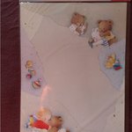 Sachet de 10 feuilles format A4, papier à lettres, fond à rayures beiges avec décor adorables bébés et petits oursons.