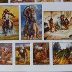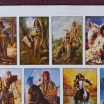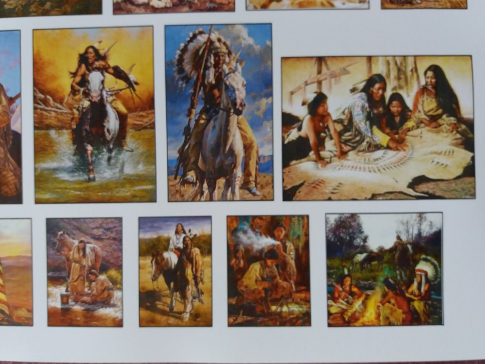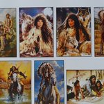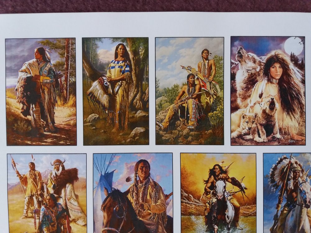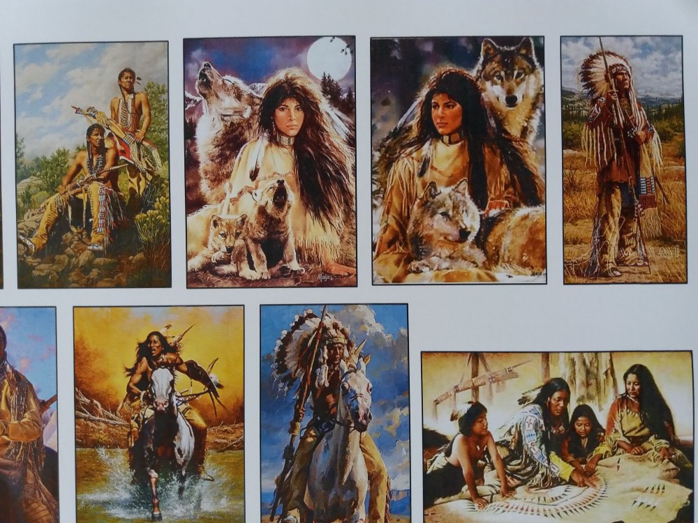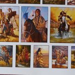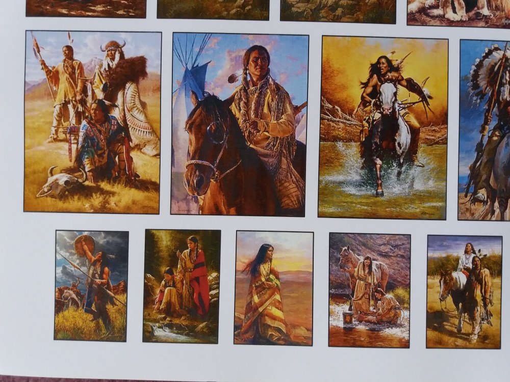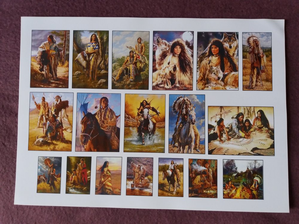 Planche adhésive, vignettes autocollantes représentant différents amérindiens dans leur environnement quotidien, un univers peuplé de mystères, de mythes et de légendes. Les rites chamaniques, la communion avec la nature, les animaux et les esprits, qu'ils pratiquent depuis toujours, exercent, sur nous, une étrange fascination.