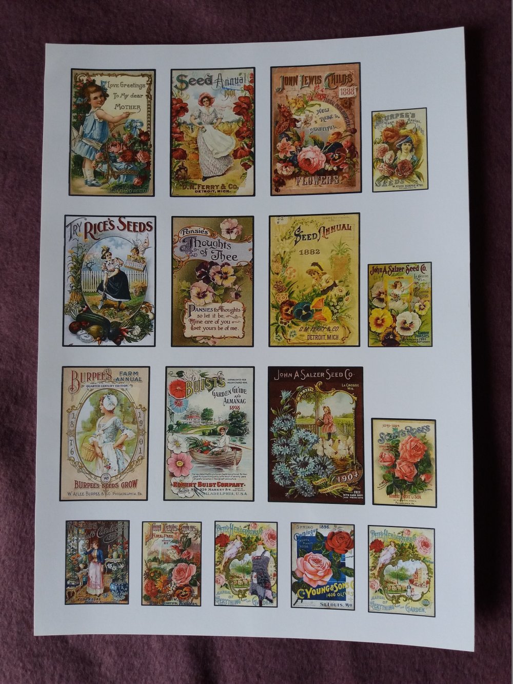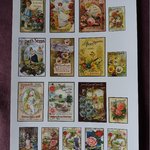Planche adhésive vignette avec illustrations d'anciennes publilcités américaines plantes, graines et fleurs.